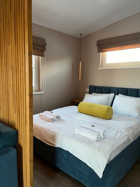 Что внутри: 1 спальня, гостиная. Кухня со всем необходимым: посуда, приборы, кухонные принадлежности (кастрюли, сковороды, дуршлаг, тёрка, доски, ножи и др.), электрический чайник, капсульная кофемашина, варочная панель, холодильник с морозильной камерой, чай, кофе, сахар.