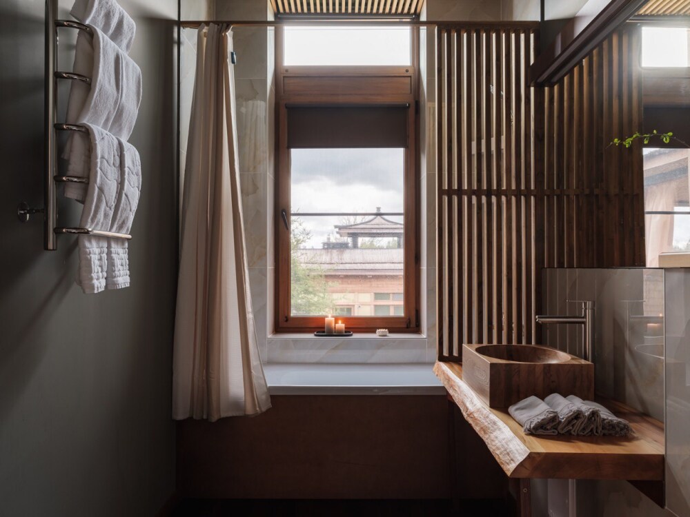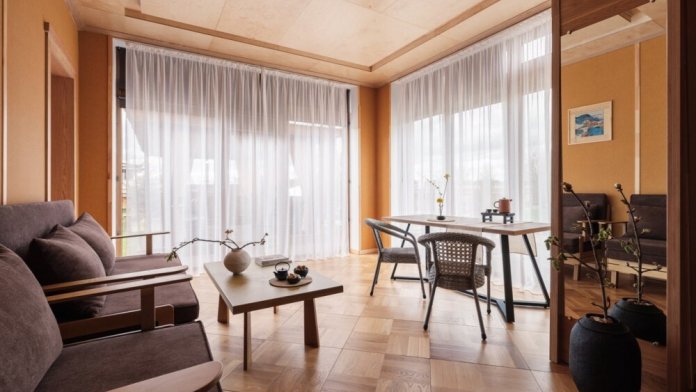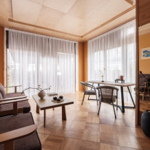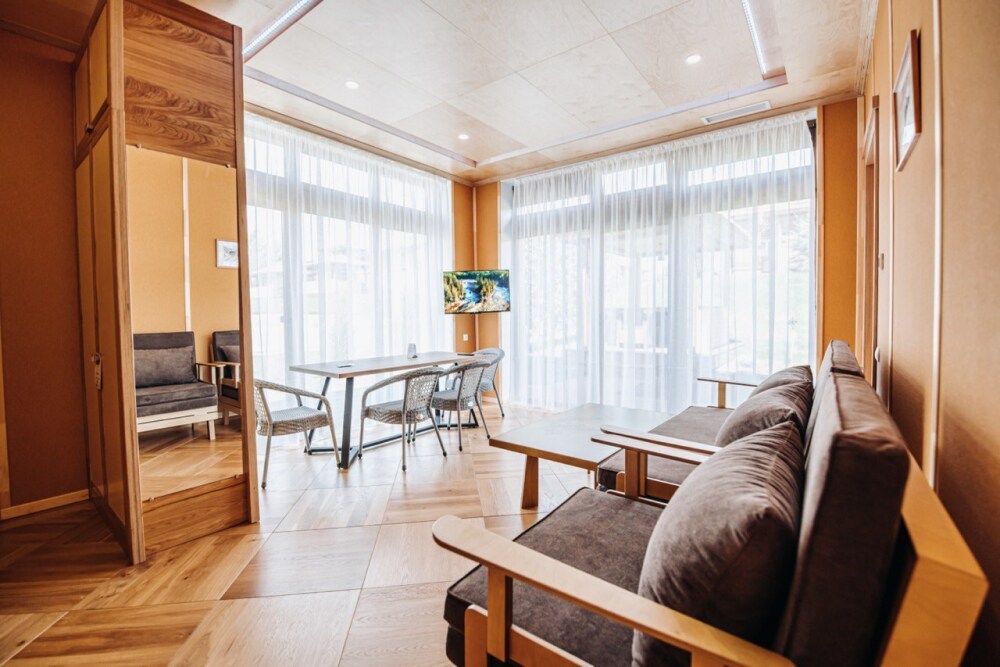 В апартаментах президентского люкса вы найдете просторную спальню с комфортной кроватью и элегантной мебелью, сауной и бочкой фурако на террасе. Один ребёнок до 3 лет — можно без отдельного спального места.