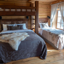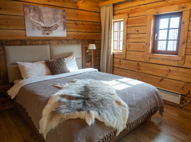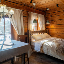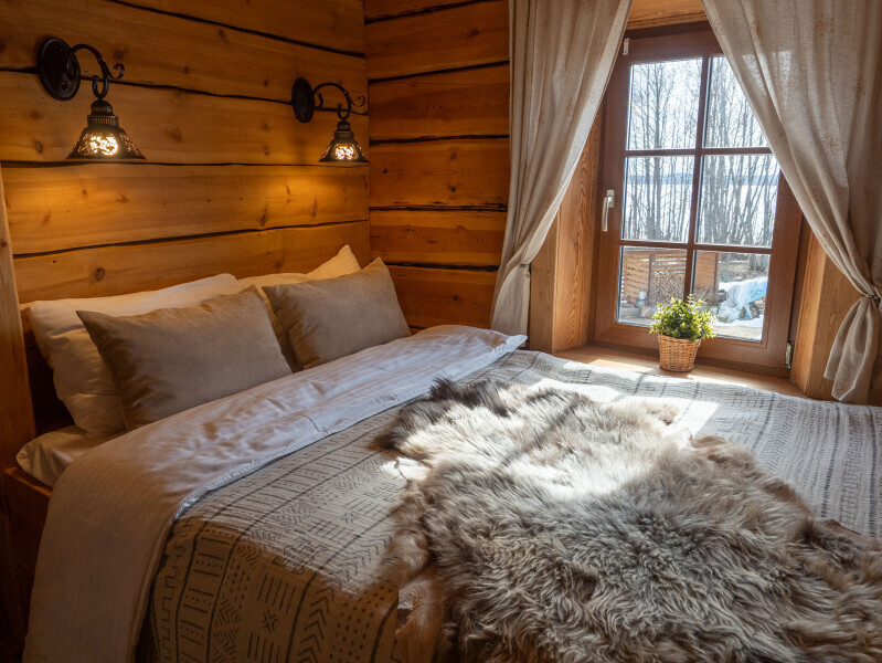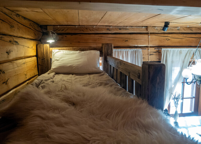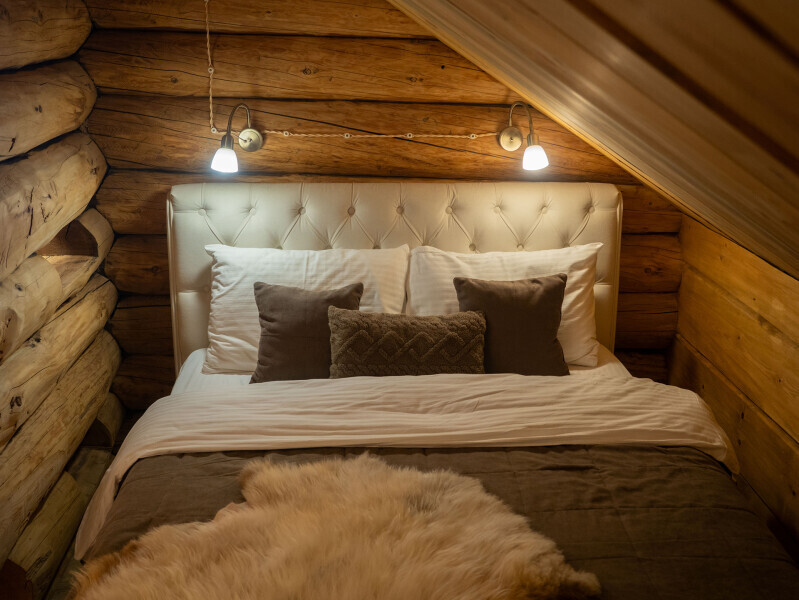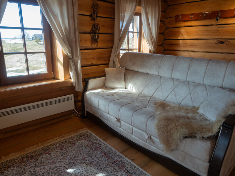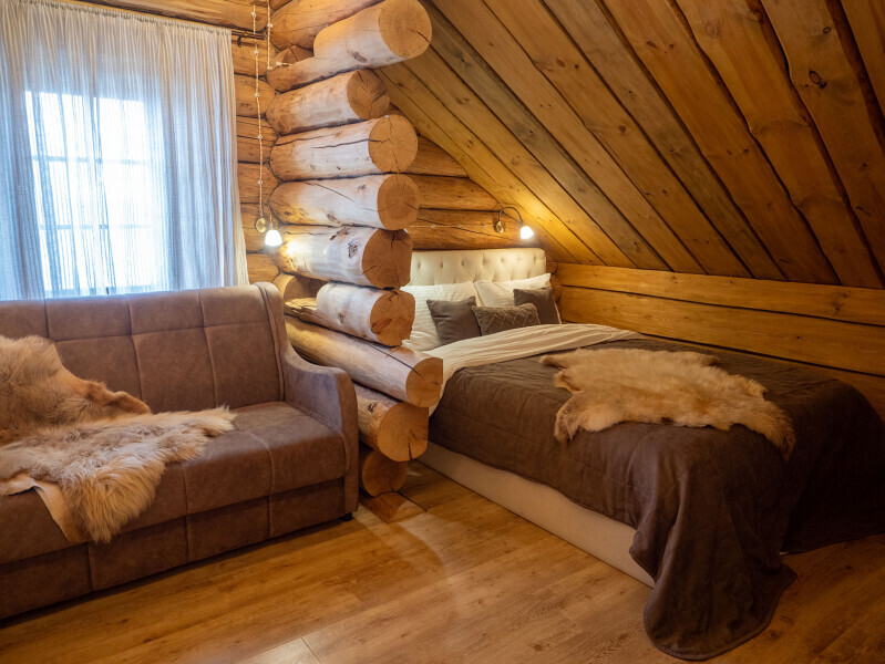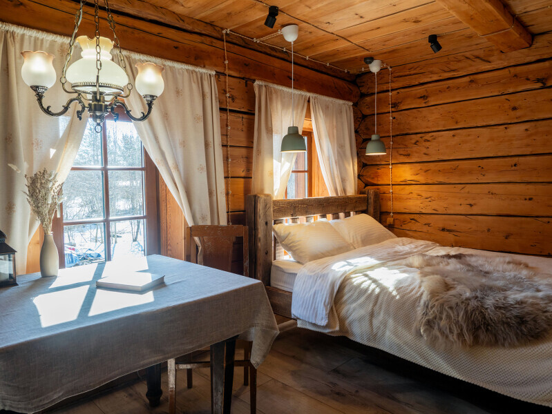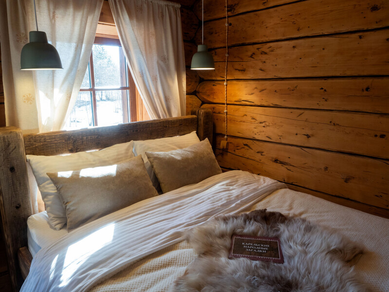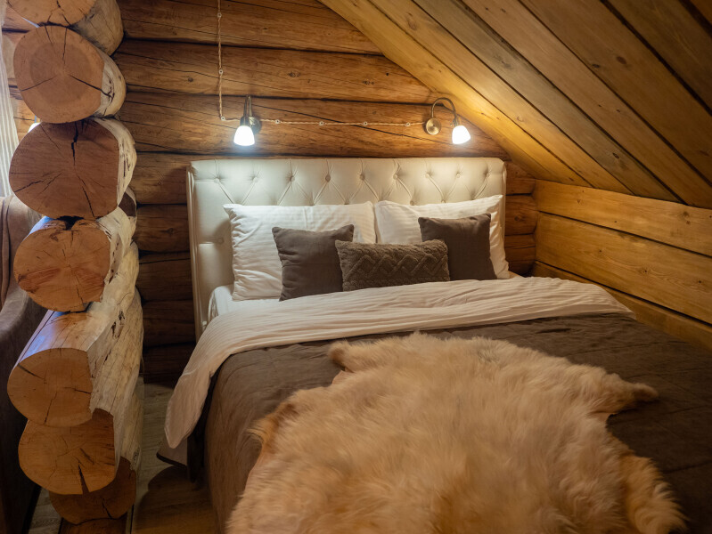 Наша светёлка оснащена большой кроватью с премиальным ортопедическим матрасом размера King Size и отлично подойдёт для семейной пары. В светлые карельские белые ночи о вашем сне позаботятся плотные шторы блэкаут.