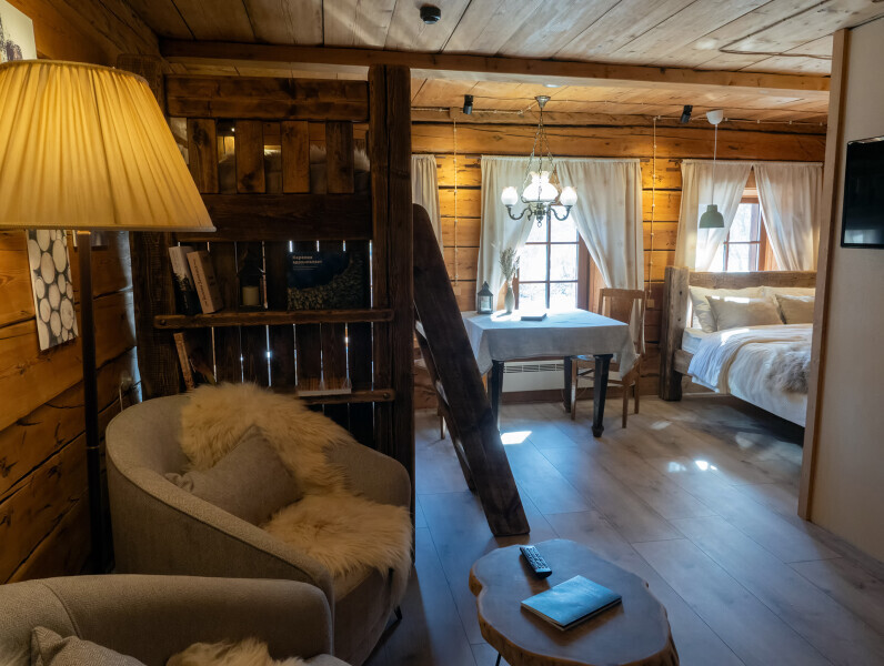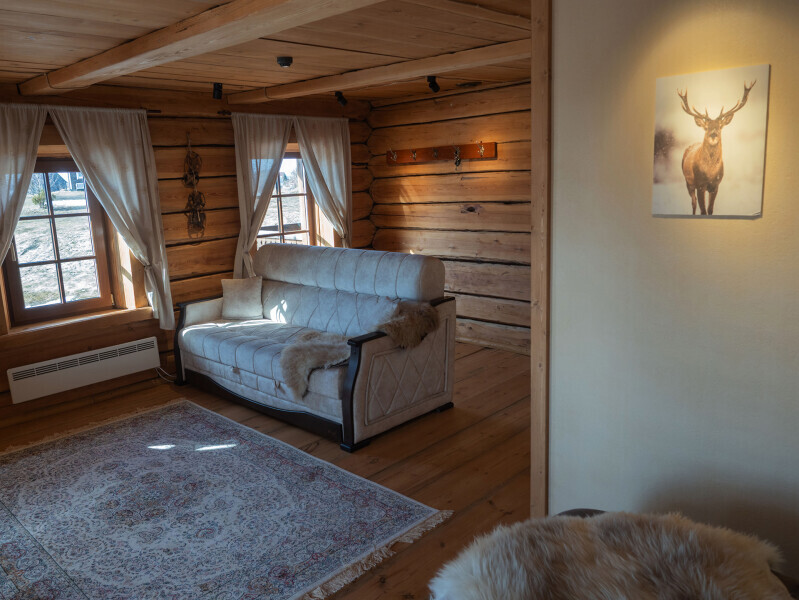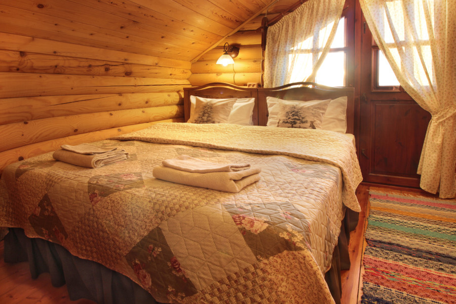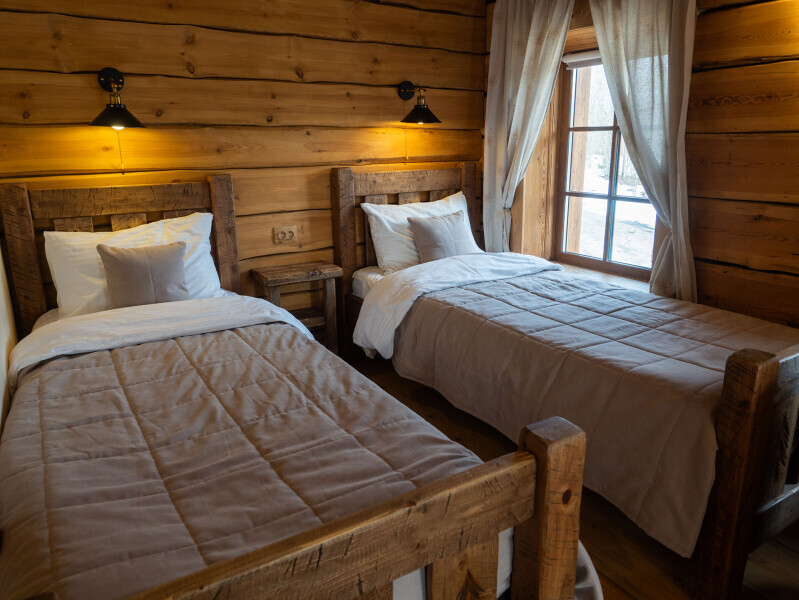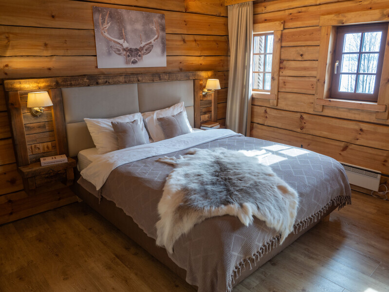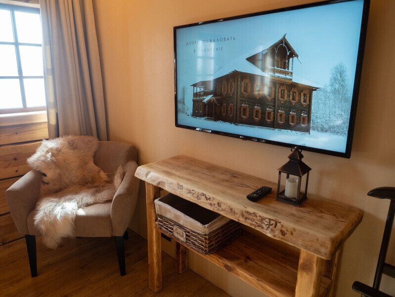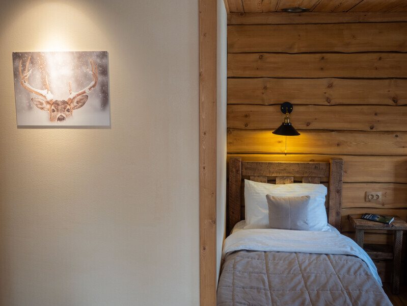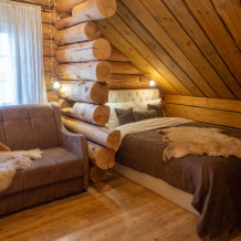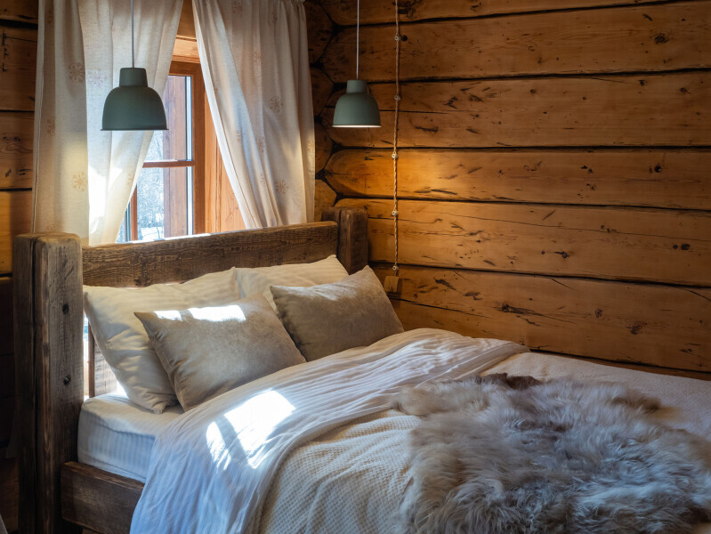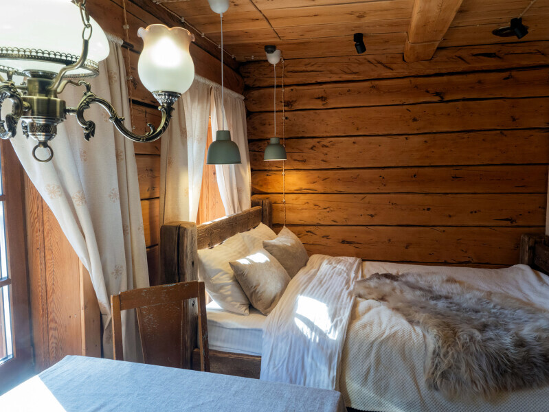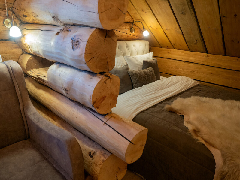 Наша светёлка оснащена большой кроватью с премиальным ортопедическим матрасом размера King Size и отлично подойдёт для семейной пары. В светлые карельские белые ночи о вашем сне позаботятся плотные шторы блэкаут.