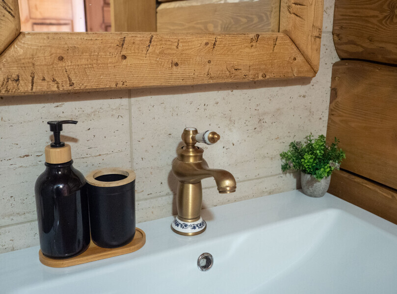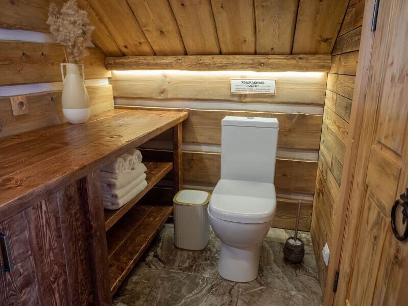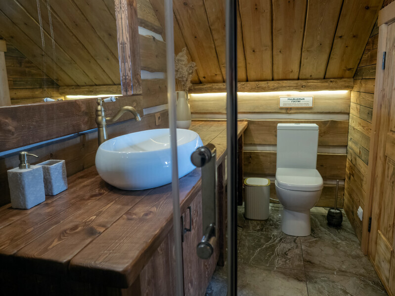 Современный стильный санузел с тёплым полом имеет большую душевую с тропическим душем. В полностью натуральной деревянной комнате легко дышится благодаря уникальной системе вентиляции. Через окно, выходящее на север можно любоваться летними закатами, а зимой только из этой комнаты можно увидеть северное сияние!