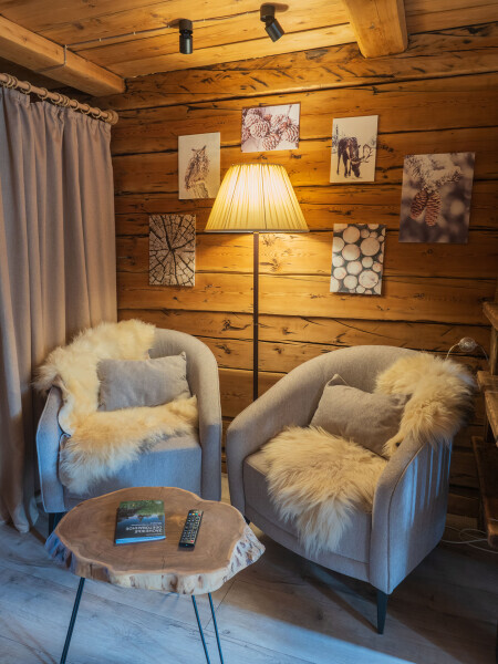 Уютная тихая комната с мягким светом в стиле классического Альпийского шале.