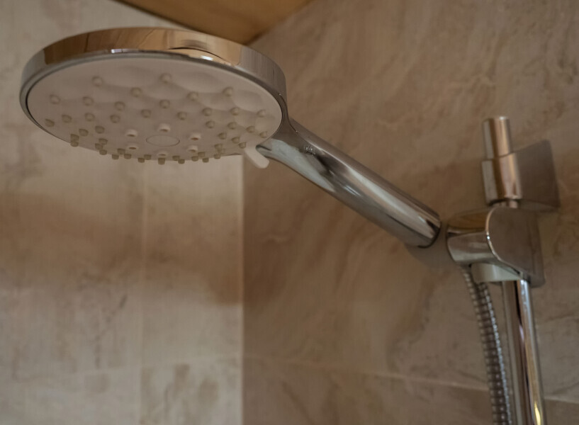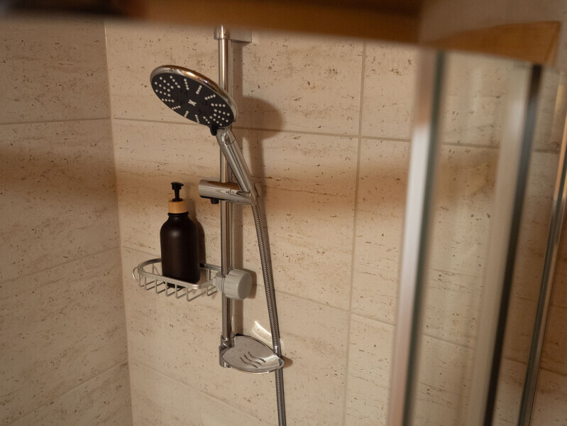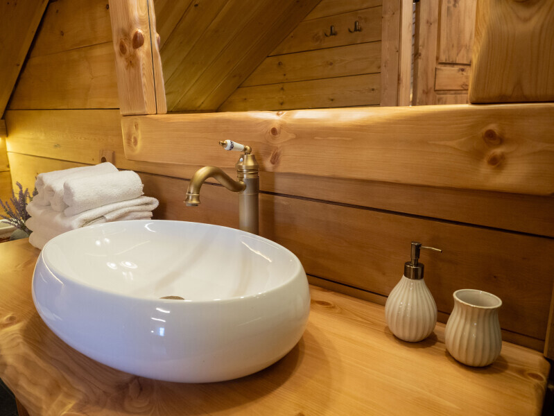 Современный стильный санузел с тёплым полом имеет большую душевую с тропическим душем. В полностью натуральной деревянной комнате легко дышится благодаря уникальной системе вентиляции.