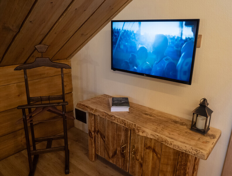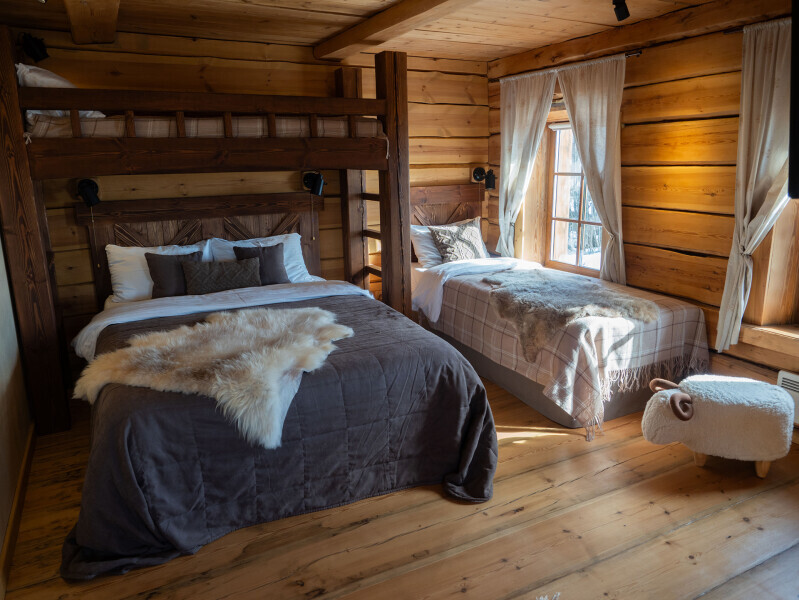 В комнате есть своя зона отдыха с телевизором, стол для работы, двуспальная кровать и большая массивная двухъярусная, которую очень любят дети, а при желании и пара взрослых с удовольствием разместятся на ней. Все спальные места оснащены премиальными ортопедическими матрасами.