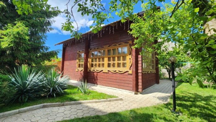 Во дворе детский городок с домиком, место для стоянки машины, мангал с коптильней, пруд с фонтаном, водопадом и рыбками, площадка для отдыха.