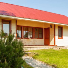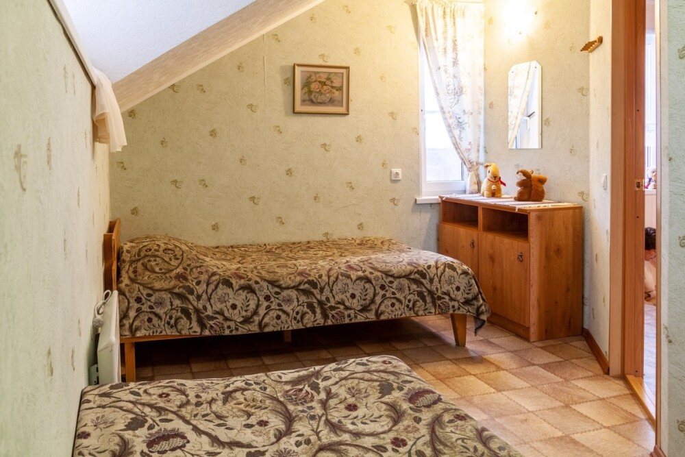 Холл с большими окнами и высокими потолками с балками. В этой же комнате 2 раскладных дивана (для комфортного сна предоставим доп. наматрасники), журнальный стол (раскладывается), телевизор, зеркало, старинный сундук, шкаф с сувенирами и зона прихожей. Через дверь - кухня с полным набором посуды, электрическая варочная панель; далее - маленькая комната с диванчиком (раскладывается) и телевизором, из этой комнаты лестница ведёт в спальню с 2 основными местами. В доме санузел, горячая вода. Отопление - электрические тёплые полы (кафель, ламинат). Зимой тепло.