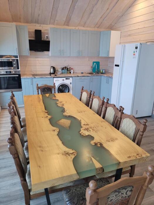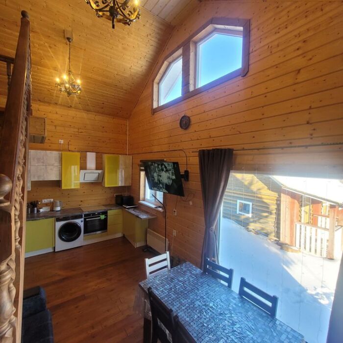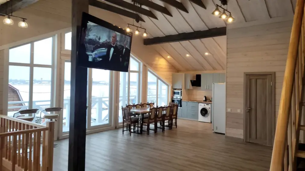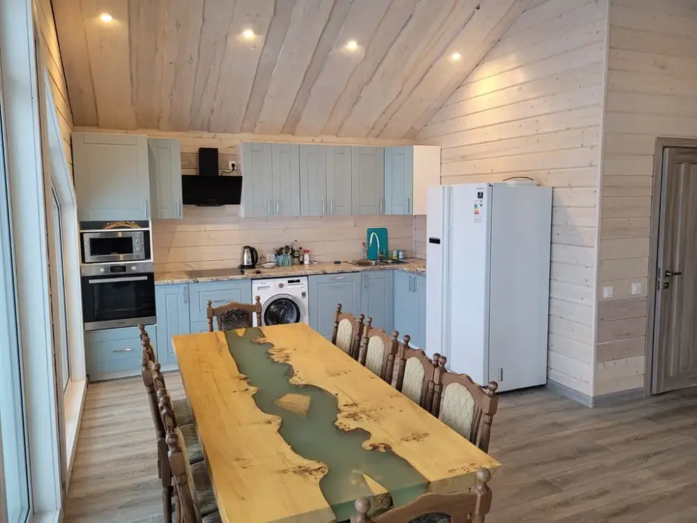- Просторная кухня с панорамными окнами и видом на р. Суна. Кухня полностью оснащена: посудомоечная машина, стиральная машина, индукционная плита, духовой шкаф, вытяжка, микроволновая печь, посуда в достаточном количестве;