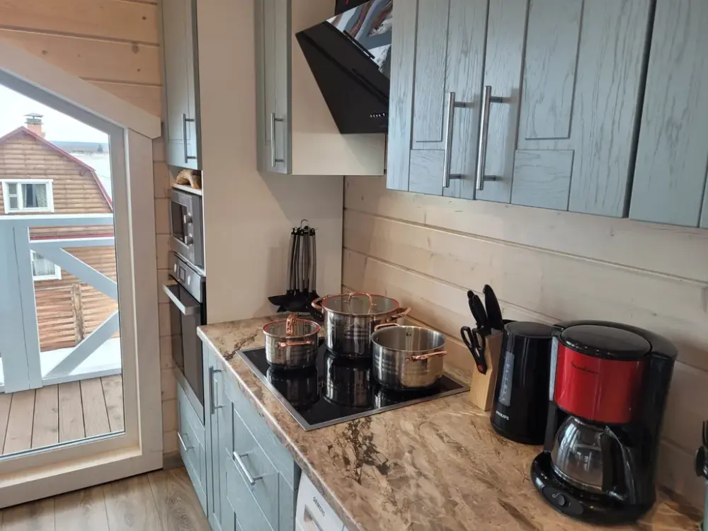 - Просторная кухня с огромными панорамными окнами и видом на р. Суна, полностью оснащена: посудомоечная машина, стиральная машина, индукционная плита, духовой шкаф, вытяжка, микроволновая печь, необходимая посуда в достаточном количестве. Для любителей кофе - кофемашина с ароматным натуральным кофе.