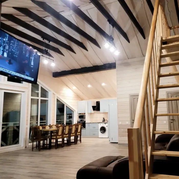 7 отдельных спальных комнат, 5 санузлов, 2 полноценные кухни, 2 гостиных и сауна с просторной комнатой отдыха в доме. Настольный футбол, огромный телевизор. Отопление осуществляется системой теплых водяных полов.