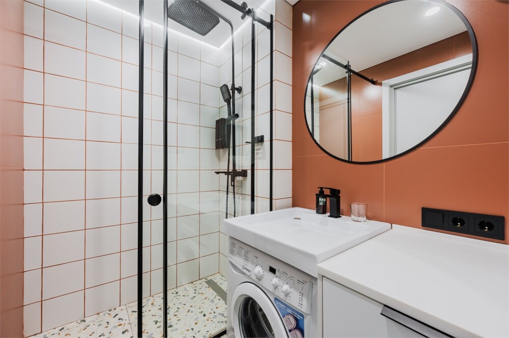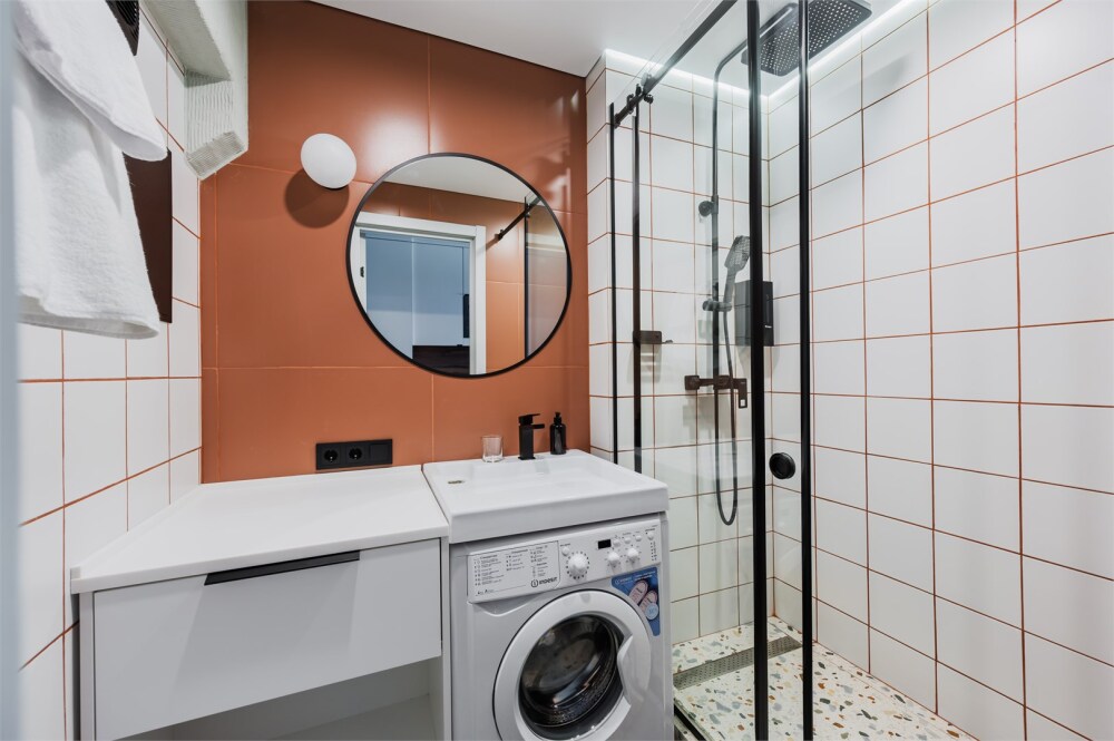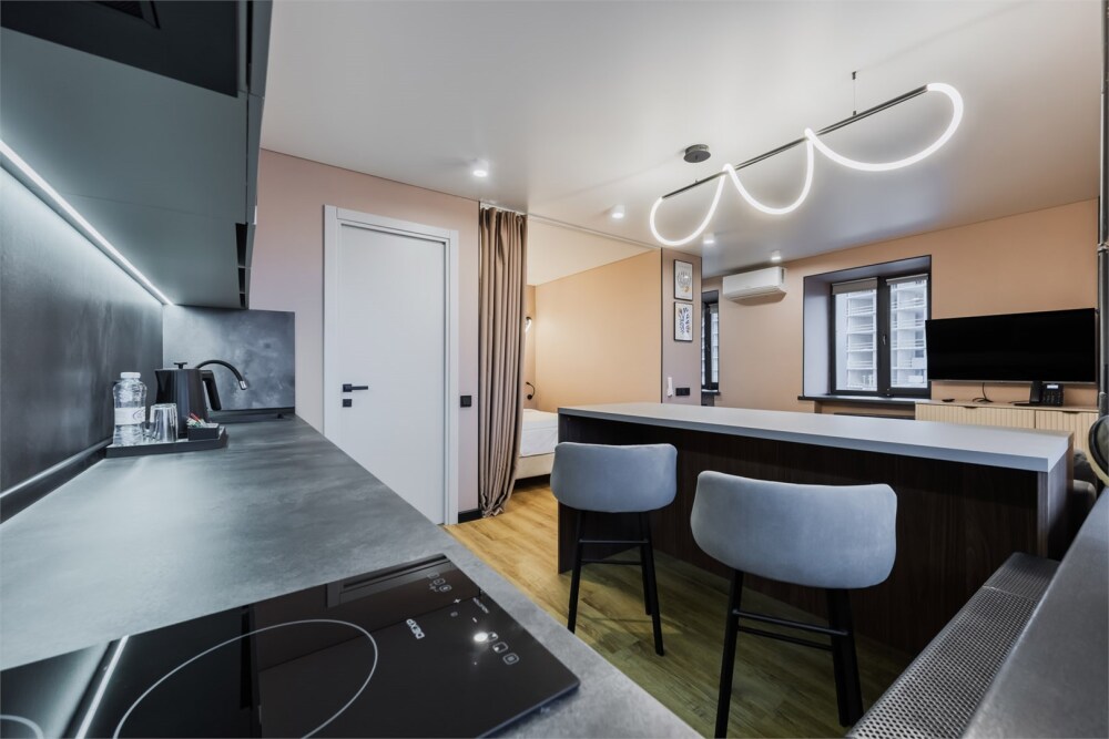 Оснащение номера: закрытая система хранения вещей, рабочая зона, обширная кухонная зона (холодильник, микроволновая печь, чайник), набор посуды и столовых приборов, полотенца, кондиционер, телевизор 43 дюйма, стиральная машина.