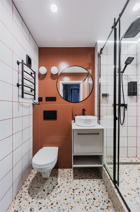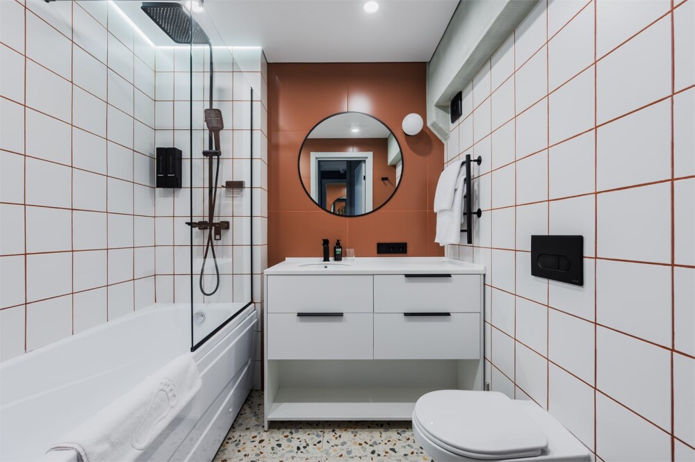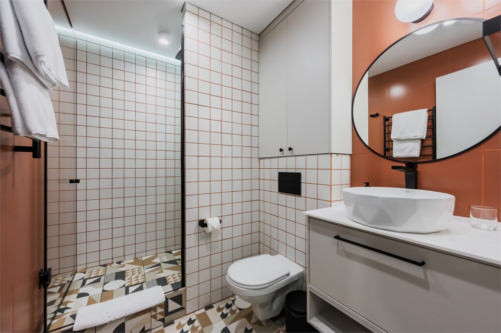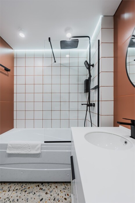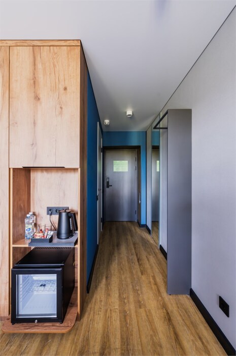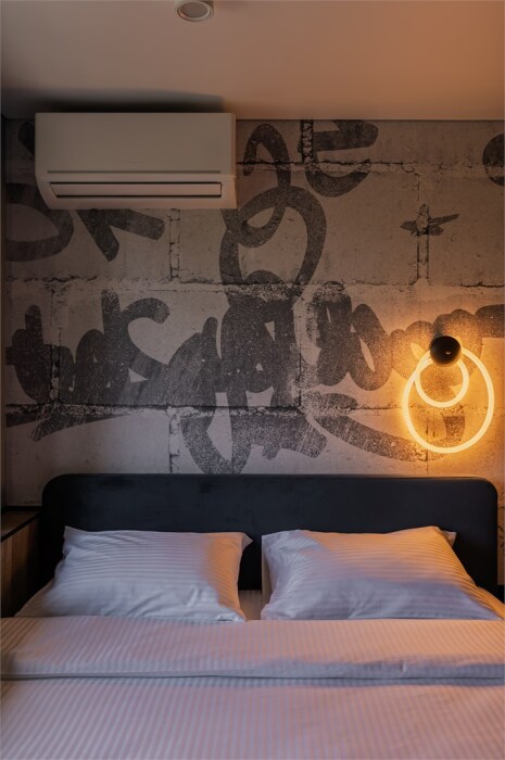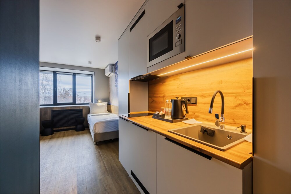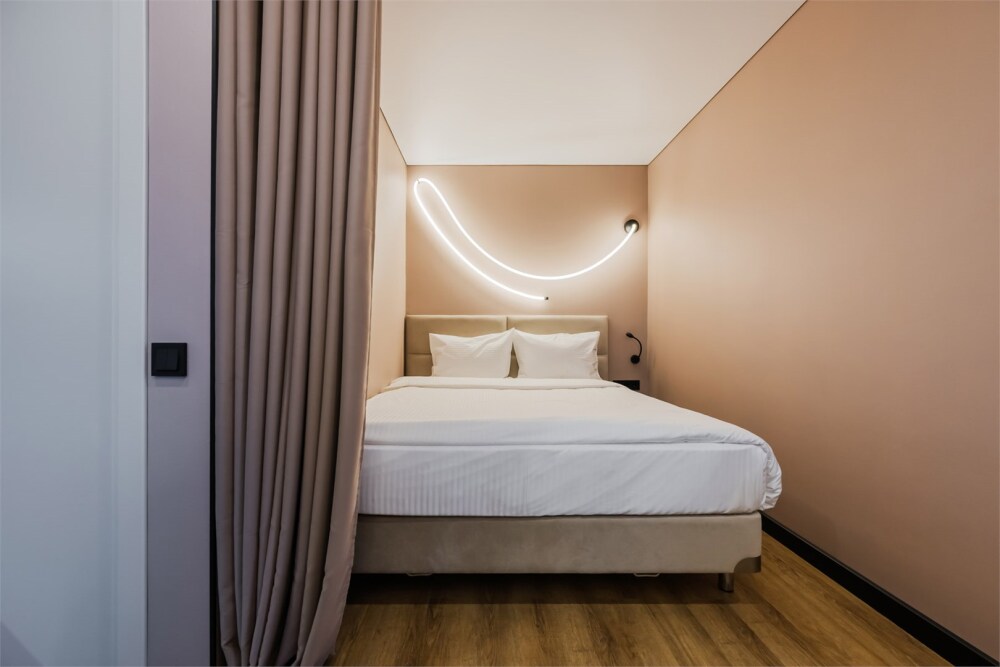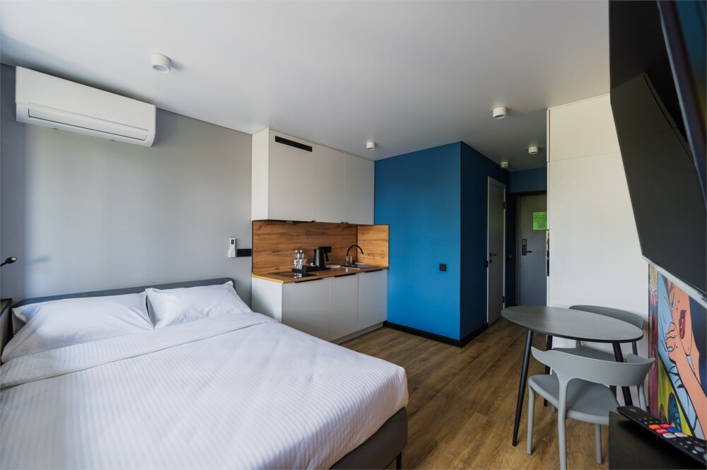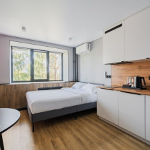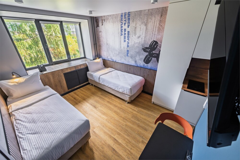 Оснащение номера: 2 кровати Single (с возможностью сдвинуть в одну); Ортопедические матрасы Ascona; Закрытая система хранения вещей; Рабочая зона; Кухонная зона (холодильник, микроволновая печь, чайник, стиральная машина); Набор посуды и столовых приборов; Полотенца; Кондиционер; Телевизор 43 дюйма; Несколько сценариев освещения.
