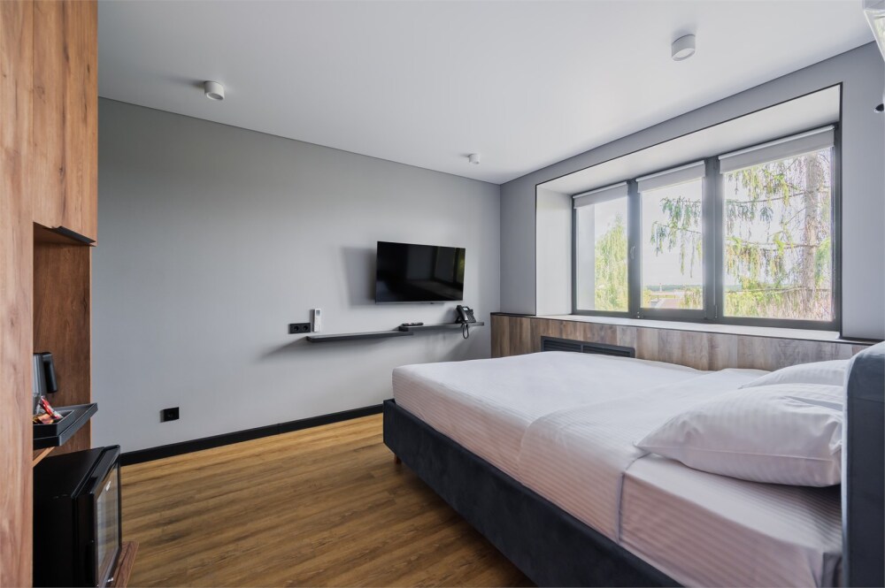 В номере есть: кровать kingsize, закрытая система хранения вещей, рабочая зона, полотенца, кондиционер, шторы блэкаут, телевизор 43 дюйма, ванна.