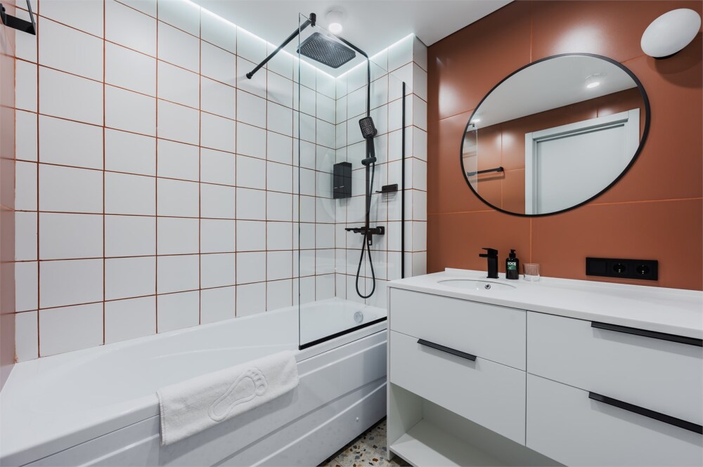Оснащение номера: Кровать Kingsize с ортопедическим матрасом Ascona Family comfort, Двуспальный раскладной диван, Закрытая система хранения вещей, Зона отдыха, Кухонная зона (холодильник, микроволновая печь, чайник, посудомоечная машина, стиральная машина), Набор посуды и столовых приборов, Полотенца, Кондиционер, Шторы блэкаут, Телевизор 43 дюйма, Несколько сценариев освещения, Увеличенная ванная комната.