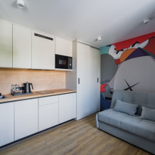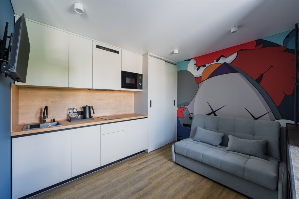 Оснащение номера: двуспальный раскладной диван, закрытая система хранения вещей, рабочая зона, обширная кухонная зона (холодильник, микроволновая печь, чайник), набор посуды и столовых приборов, полотенца, кондиционер, телевизор 32 дюйма.