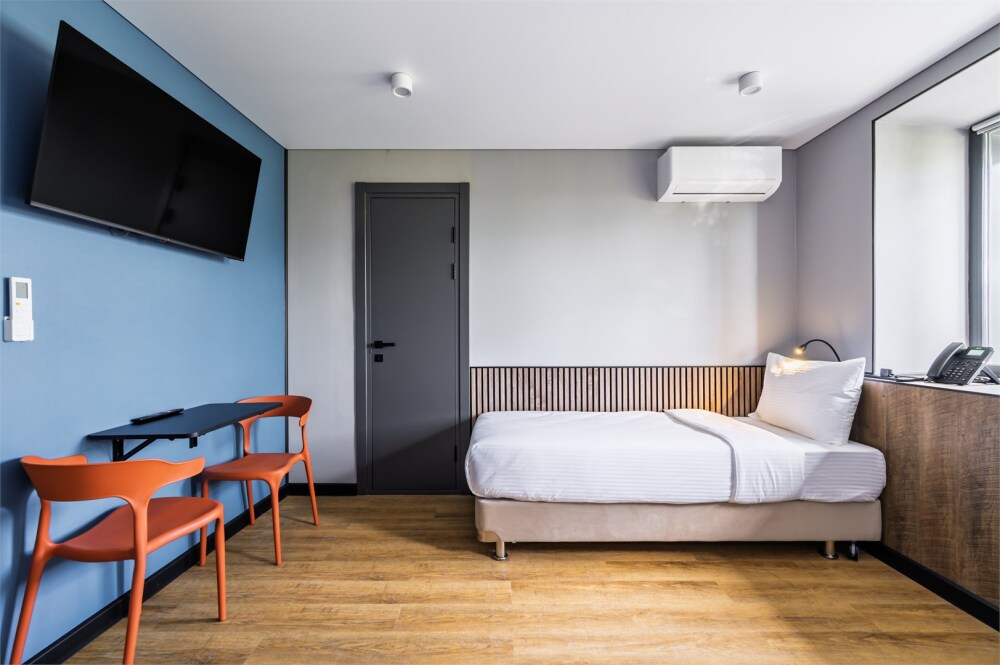 Оснащение номера: 2 кровати single (с возможностью сдвинуть в одну), ортопедические матрасы ascona, закрытая система хранения вещей, рабочая зона, кухонная зона (холодильник, микроволновая печь, чайник, стиральная машина), набор посуды и столовых приборов, полотенца, кондиционер, телевизор 43 дюйма.