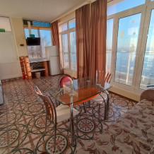 Номер 11 представлен с кухней – столовой, спальней с двуспальной кроватью, гостиной, балконом с видом на море и с сейфом. Дополнительные места предусмотрены в номере данной категории.