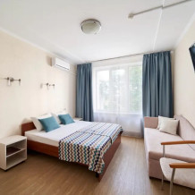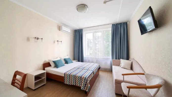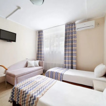 Семейный номер рассчитан на размещение двух человек, идеально подходит для семейного отдыха. Вид из номера во внутренний двор гостиницы. Площадь номера 20 кв. м. В номере возможно дополнительное место (диван)