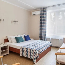 Комфортный номер улучшенной комплектации, рассчитан на размещение одного или двух человек, подходит для отдыха или работы в деловых поездках. Вид из номера во внутренний двор гостиницы. Площадь номера 22 кв. м. В номере возможно дополнительное место (диван)