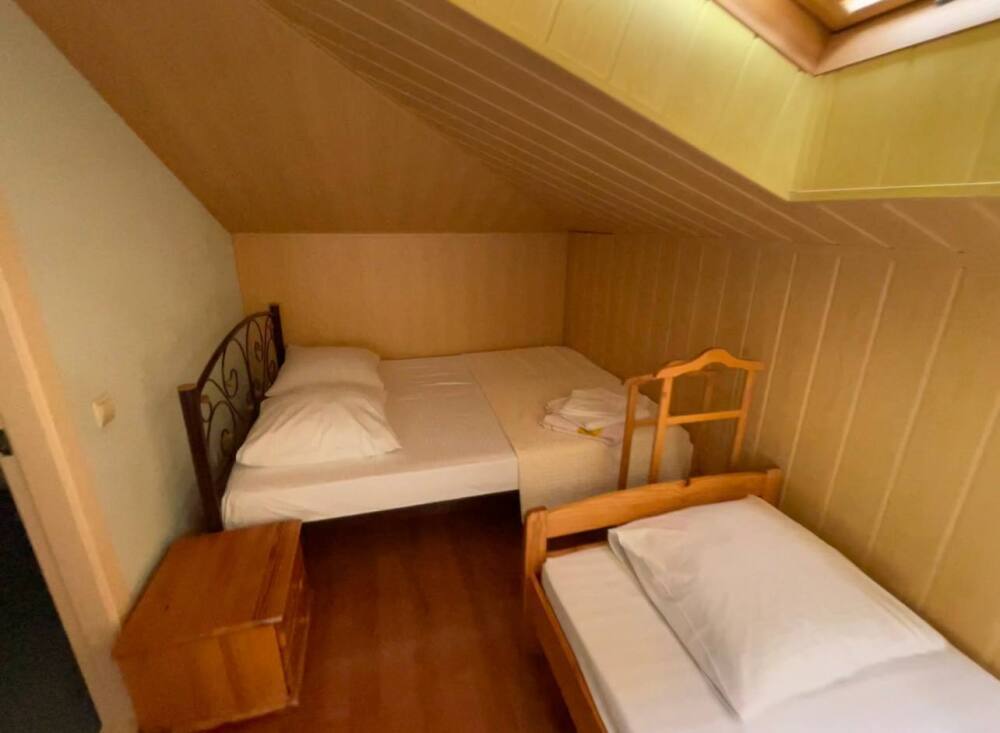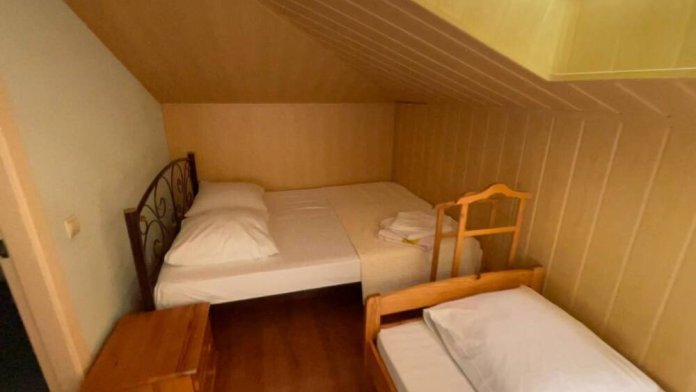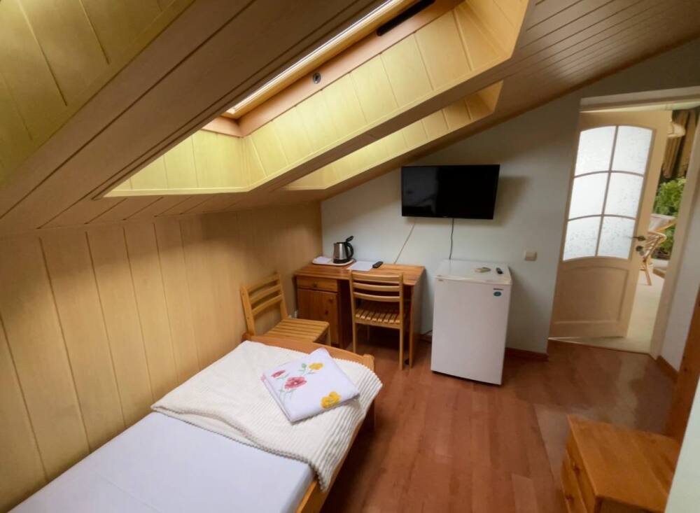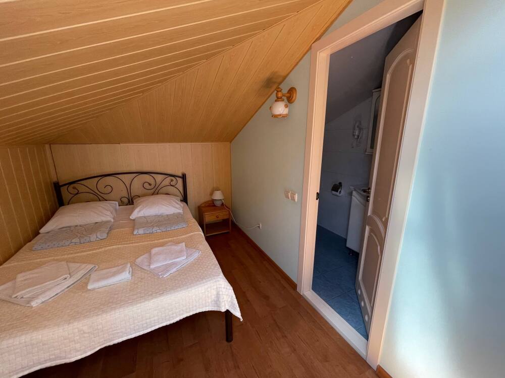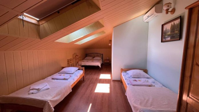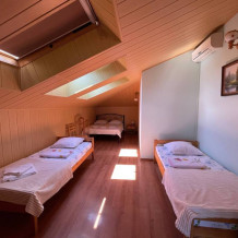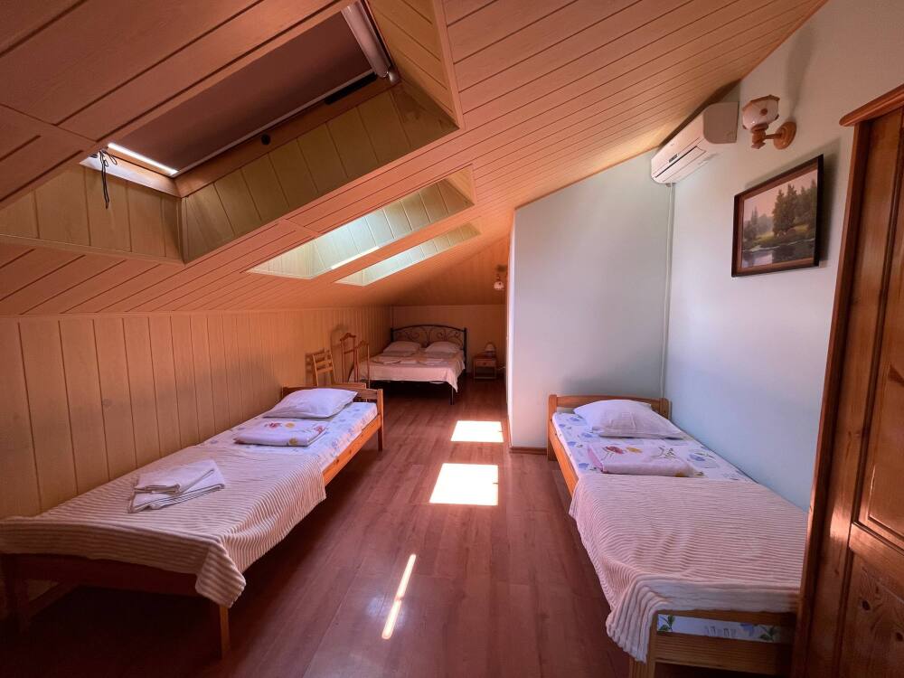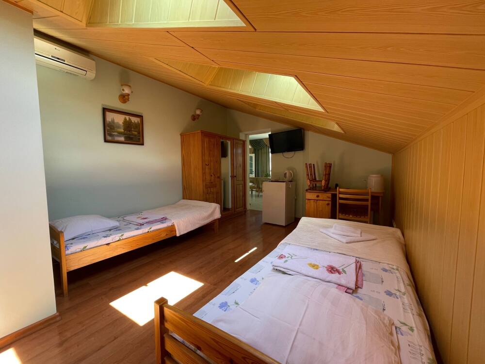 Номер рассчитан на 2-3 человека. В номере есть кондиционер, телевизор, кабельное телевидение, сейф, Wi-Fi, санузел с душевой кабиной и феном. Номер оборудован набором посуды, чайником и холодильником. Горячая и холодная вода доступны круглосуточно. Ежедневная уборка производится с влажной уборкой помещения. К вашим услугам кухня для самостоятельного приготовления пищи, мангал, садовый камин и парковка для автомобиля на закрытой территории.На этаже выход на красивую террасу.