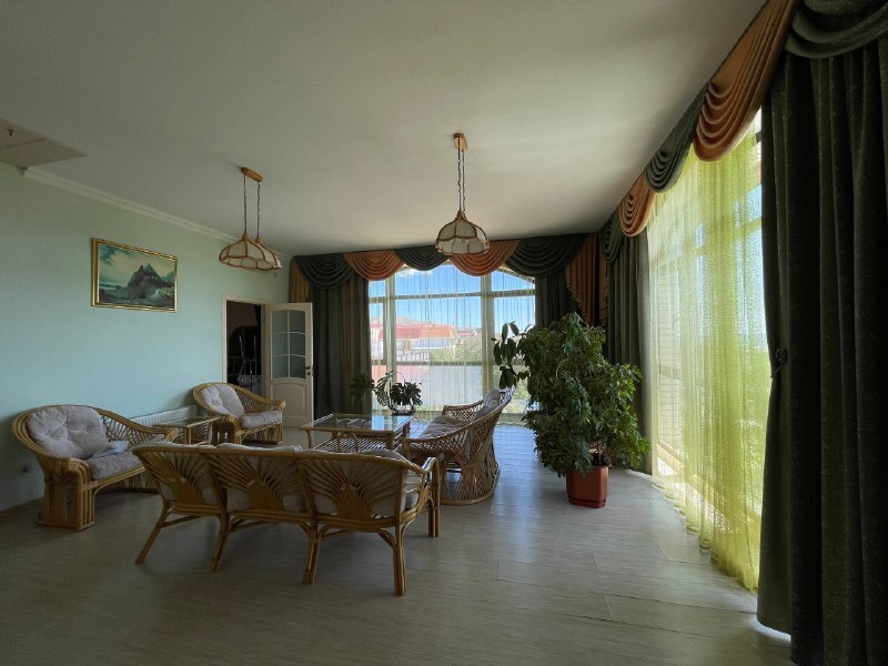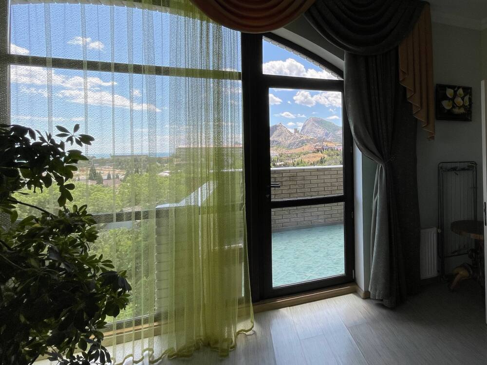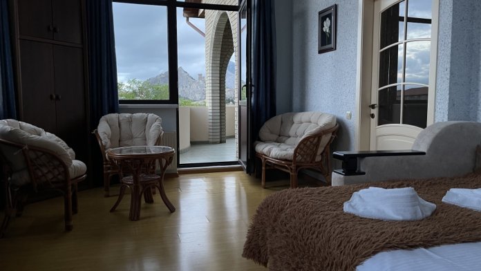 Номер выходит в просторный холл с ротанговой мебелью, здесь же балкон с живописным видом на море, горы и Генуэзскую крепость. Мебель в номере из натурального дерева, что создает особый уют.
