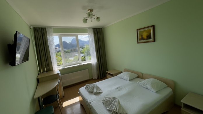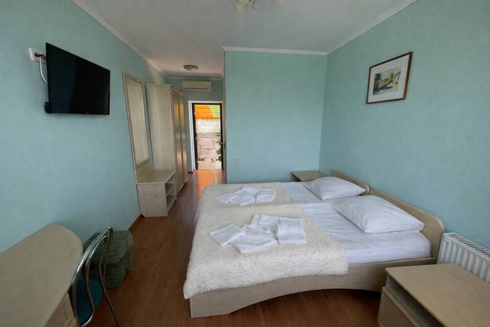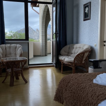 Однокомнатный номер с лоджией рассчитан на двух человек. В номере есть кондиционер, телевизор с кабельным телевидением, сейф, Wi-Fi, санузел с душевой кабиной и феном. Горячая и холодная вода подаются круглосуточно. Ежедневная влажная уборка. В вашем распоряжении кухня для самостоятельного приготовления пищи, мангал, садовый камин и парковка для машин на закрытой территории. С лоджии открывается вид на море.