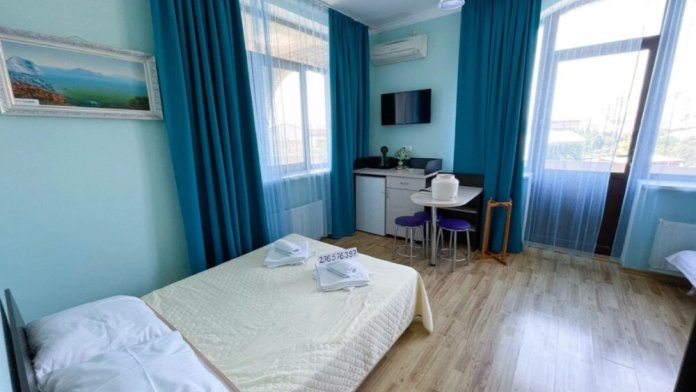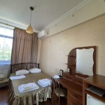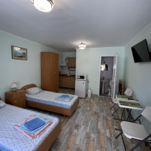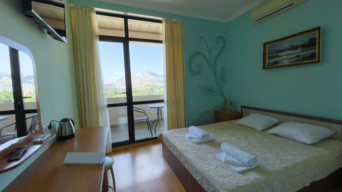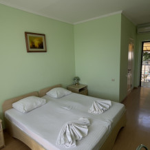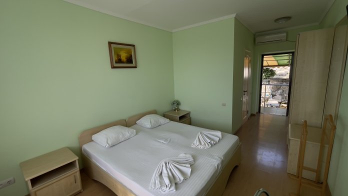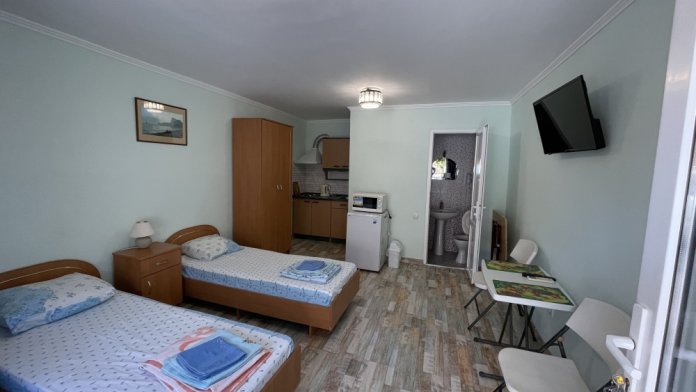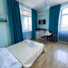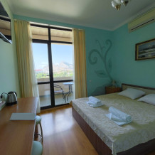 Однокомнатный номер с лоджией рассчитан на двух человек. В номере есть кондиционер, телевизор с кабельным телевидением, сейф, Wi-Fi, санузел с душевой кабиной и феном. Горячая и холодная вода подаются круглосуточно. Ежедневная влажная уборка. В вашем распоряжении кухня для самостоятельного приготовления пищи, мангал, садовый камин и парковка для машин на закрытой территории. С лоджии открывается вид на море.