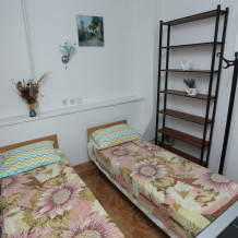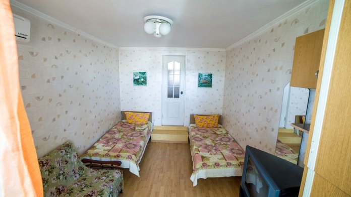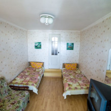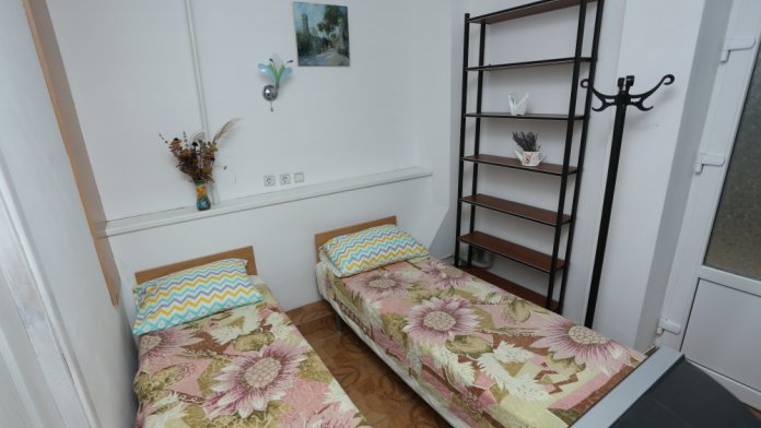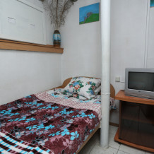 Комната с отдельным входом в пристройке к основному зданию гостевого дома. Общая площадь 2.9 х 2.53м, потолки 2.68м, две кровати 1.9 х 0.7м с ортопедическими матрацами (возможность совмещать вместе). Входная дверь и окно - стеклопакеты, кабельное телевидение, Wi-Fi, напольный вентилятор, открытый стеллаж для бытовых принадлежностей, напольные вешалки.