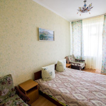 Площадь номера позволяет уютно разместить двуспальную кровать с цельным ортопедическим матрацем, диван-кровать с двумя спальными местами и кресло-кровать.