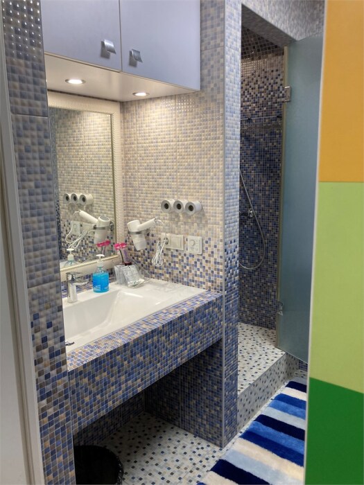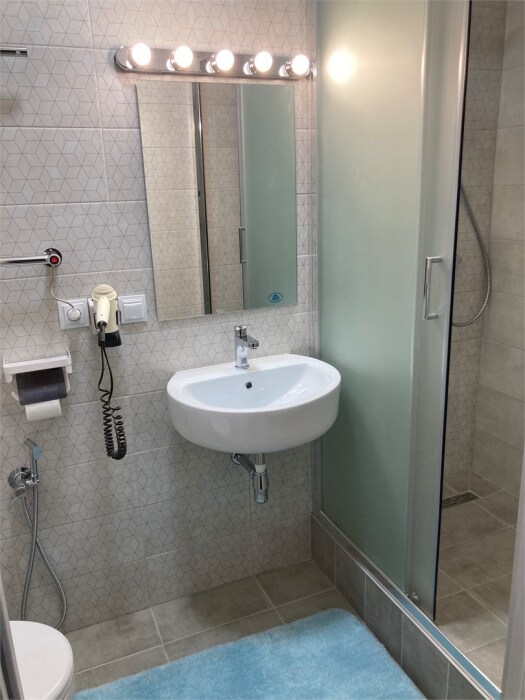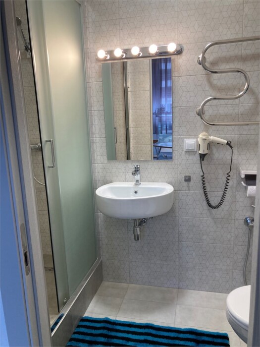 Номер стандартный оснащен мебелью, телевизором, постельными принадлежностями, полотенцами, раскладной диван служит как дополнительное место. В доступе гостей имеется общая кухня с индукционной плитой, посудой для приготовления пищи. Санузел вне комнаты слева от выхода из номера, оснащен полотенцами, предметами гигиены, феном. Номер находится в первом корпусе над кофейней. Ключи выдаются в офисе при регистрации, либо бесконтактно. Дальнейшее передвижение осуществляется через вход со двора.