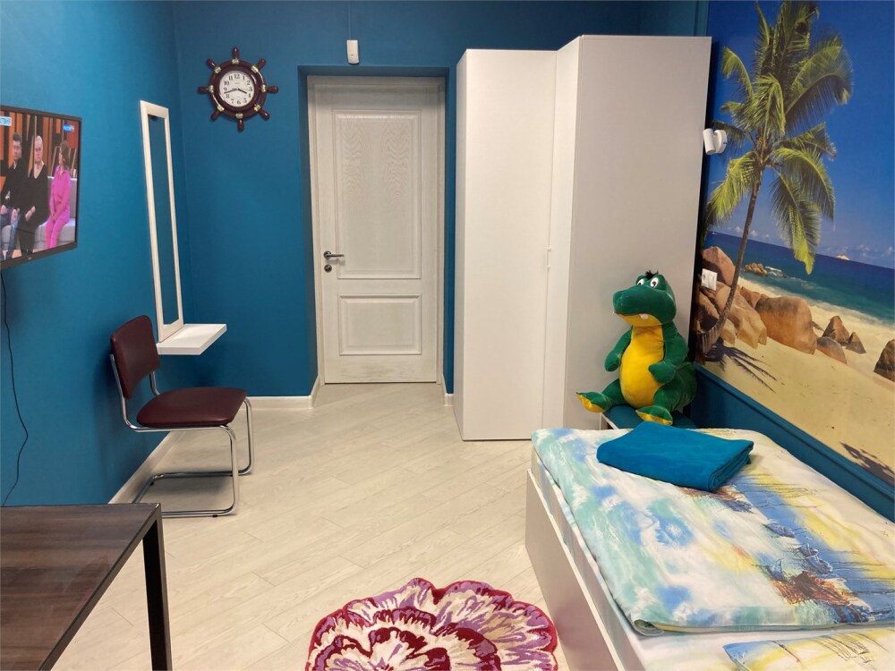Номер оснащен постельными принадлежностями, полотенцами, телевизором, спальной мебелью, в доступе гостей имеется общая кухня с индукционной плитой, посудой для приготовления пищи. Санузел для этого номера расположен рядом с комнатой, оснащен, предметами гигиены, феном. Номер находится в первом корпусе над кофейней. Ключи выдаются в офисе при регистрации, из офиса Вы можете пройти в номера.