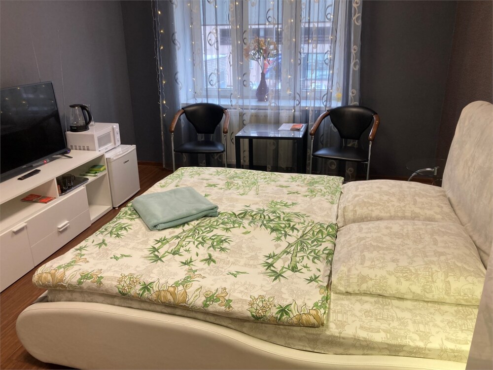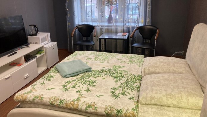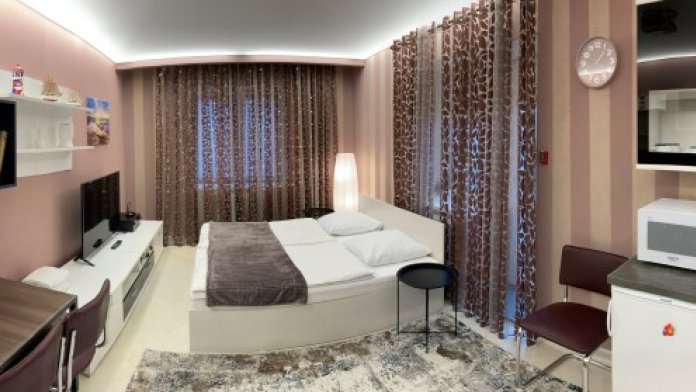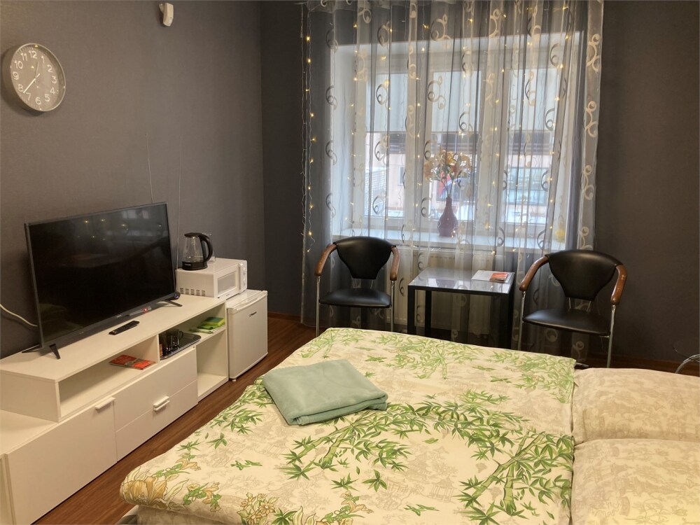 Номер оснащен постельными принадлежностями, полотенцами, телевизором, спальной мебелью, обеденной зоной, мини холодильником, микроволновкой, тостером, в доступе гостей имеется общая кухня с индукционной плитой, посудой для приготовления пищи. Санузел в комнате, оснащен, предметами гигиены, феном. Номер находится в первом корпусе над кофейней. Ключи выдаются в офисе при регистрации, из офиса Вы можете пройти в номера.