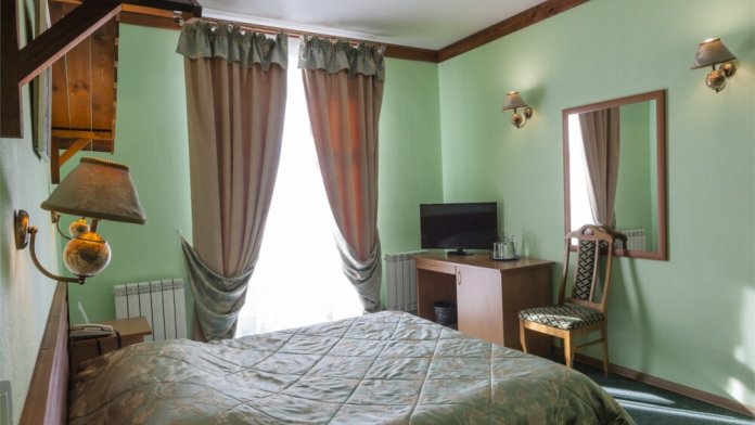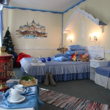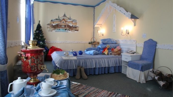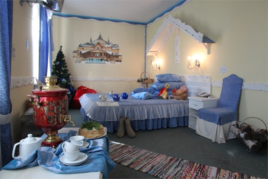 Сказочный, однокомнатный тематически оформленный номер. Именно здесь проживает Российский Дед Мороз, когда посещает наш город. Большая кровать в номере сделана по специальному заказу зимнего волшебника. Внимание! Изображение номера содержит декоративные элементы, не входящие в оборудование номера и использованные только для конкретной тематической фотосъемки.