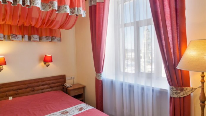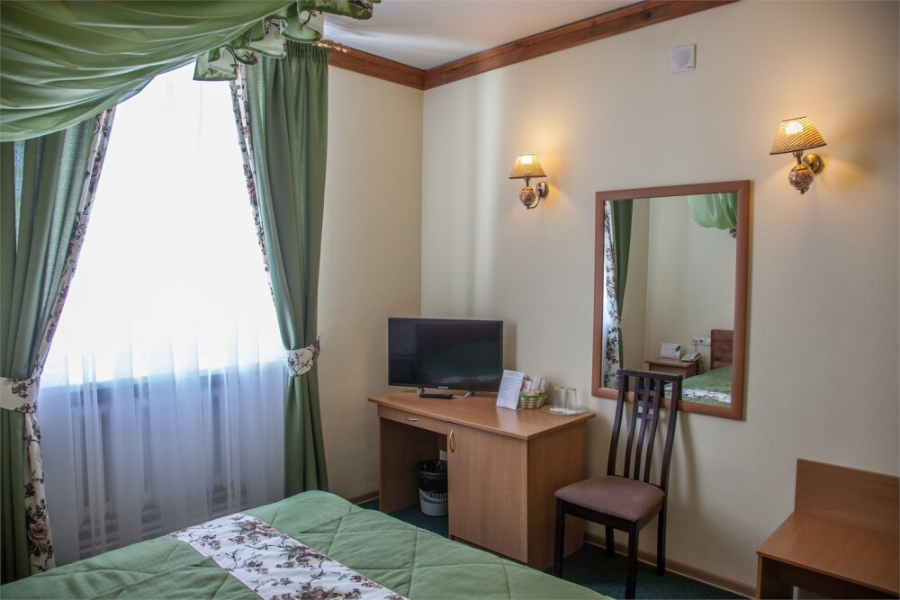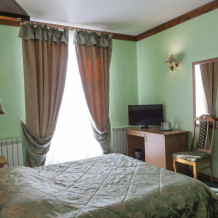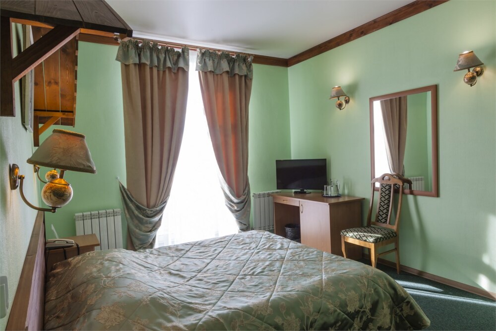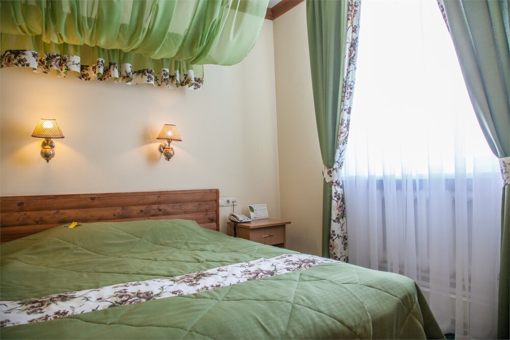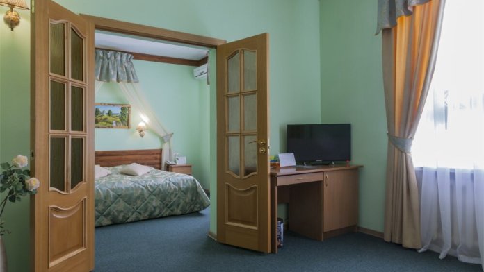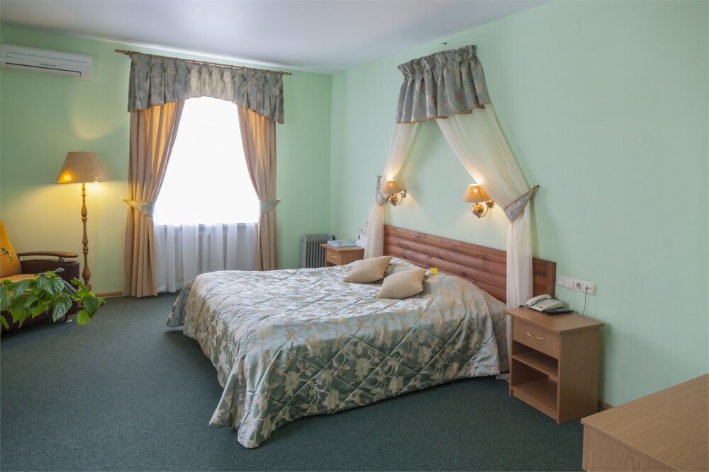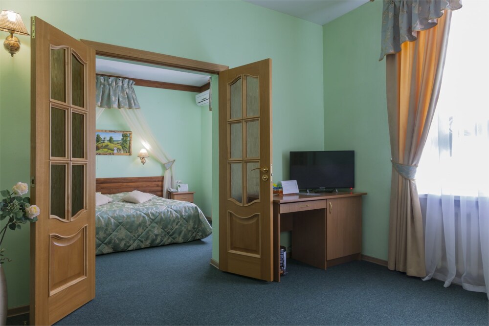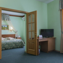 В номере категории «Люкс» прекрасный вид из окна, две комнаты, удобные для сна и отдыха. Номера данной категории по цветовому и стилистическому оформлению выполнены в коралловом или зеленом цвете. В каждом номере просторная спальня с 2-спальной кроватью.