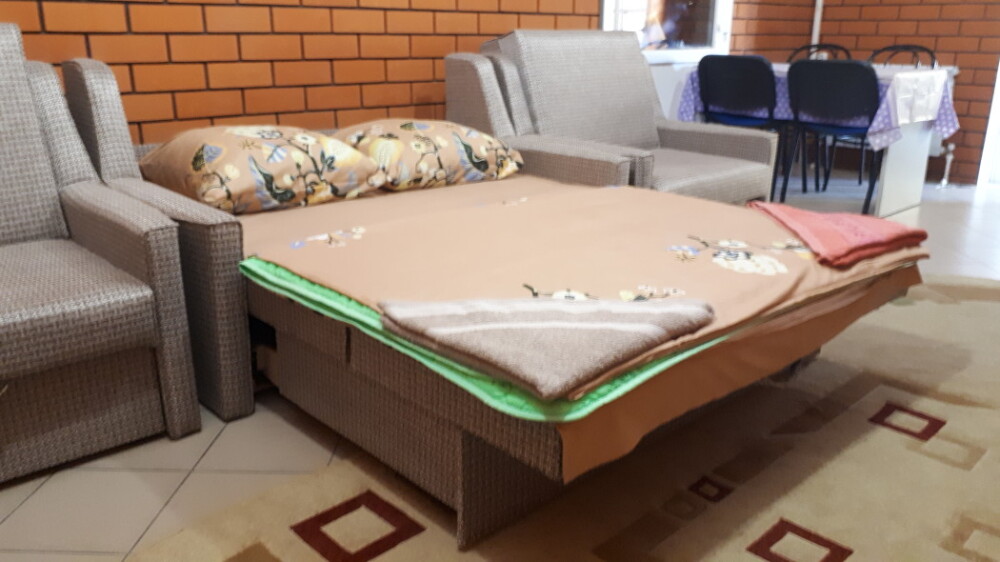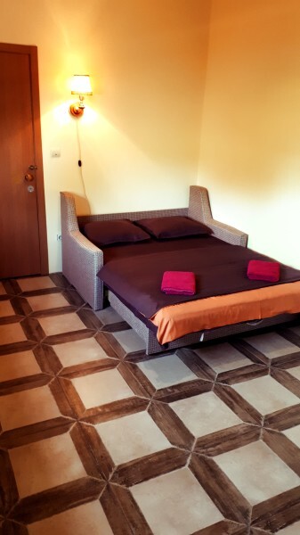 Четырехместный номер эконом с двумя диванами-кроватями и видом на сад.