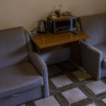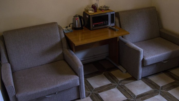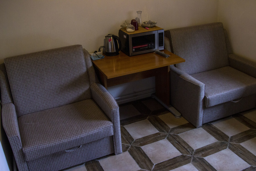 Четырехместный стандартный номер с раскладывающимися креслами и диваном и видом на внутренний двор.