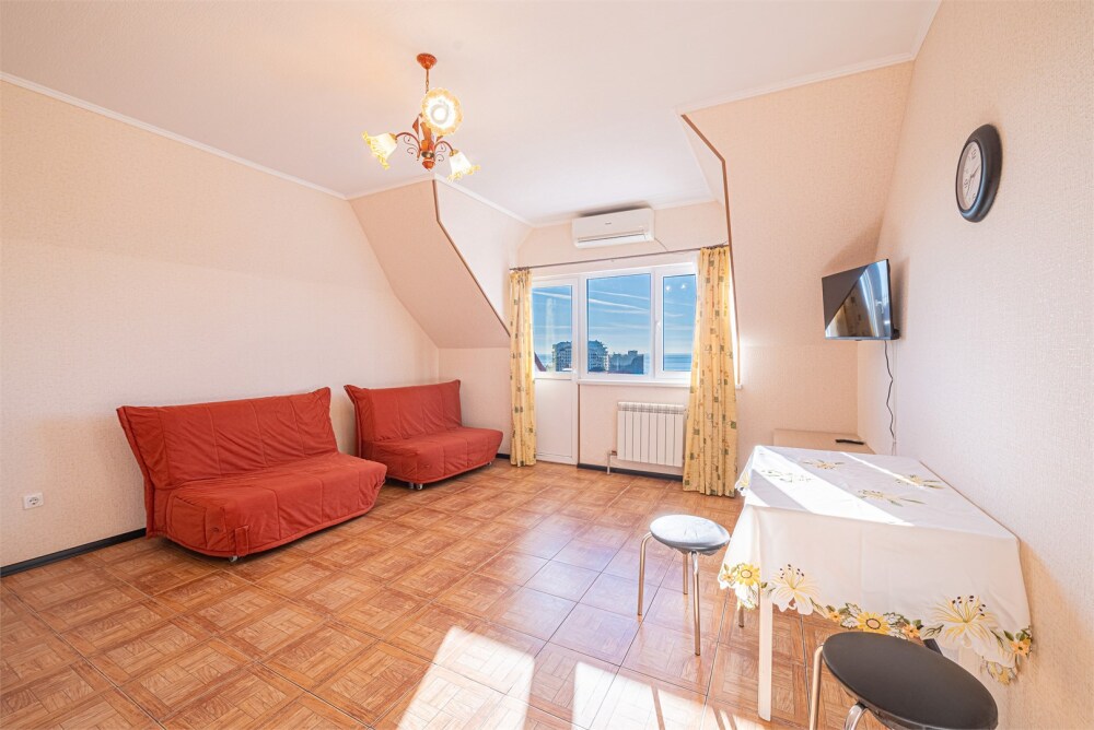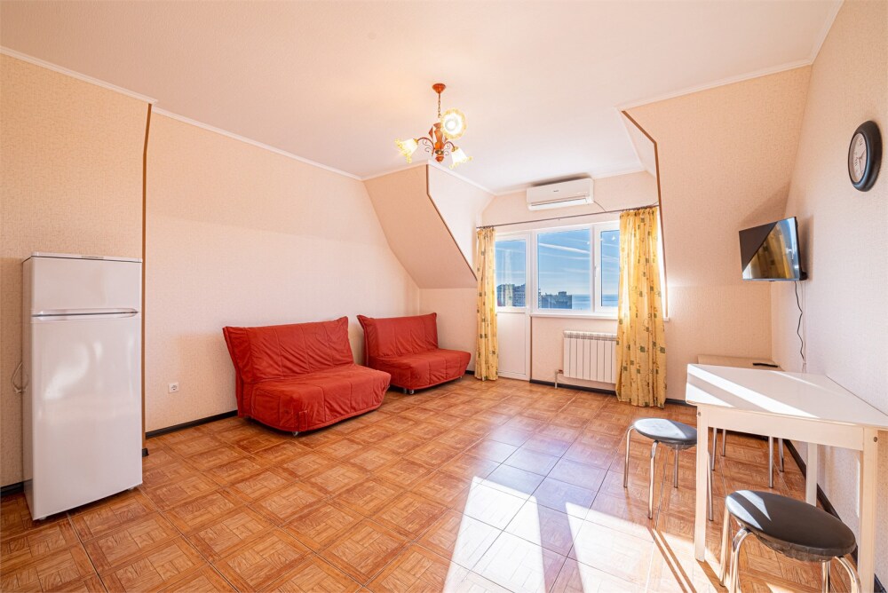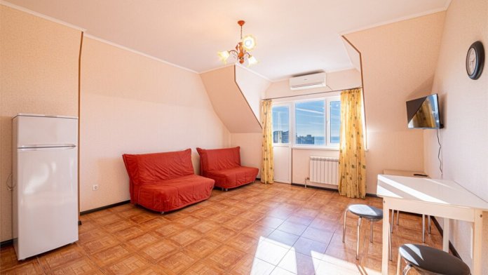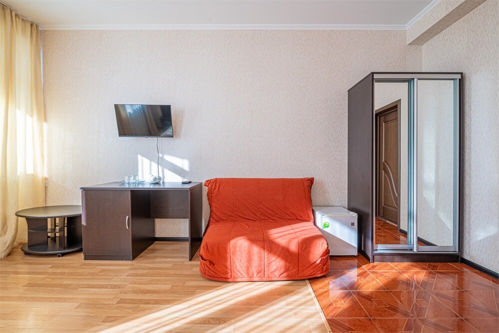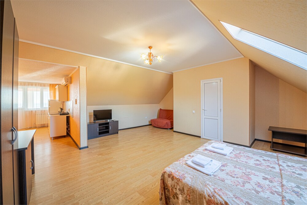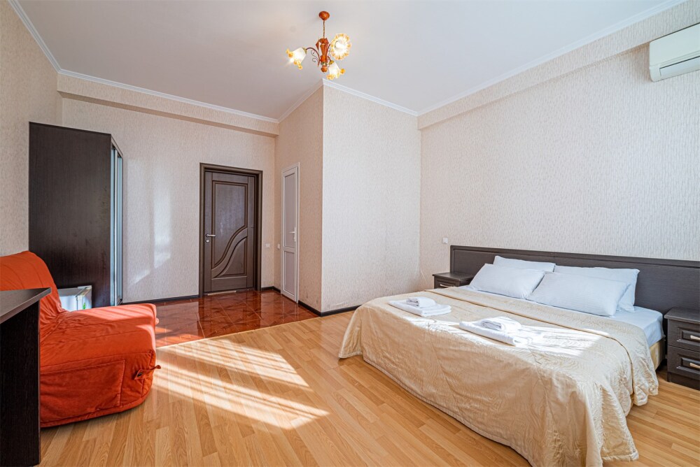 Просторный однокомнатный номер с двуспальной кроватью, раскладным диваном, кухней и балконом.