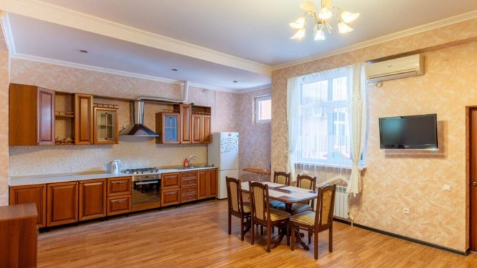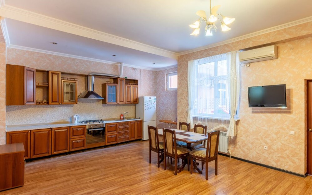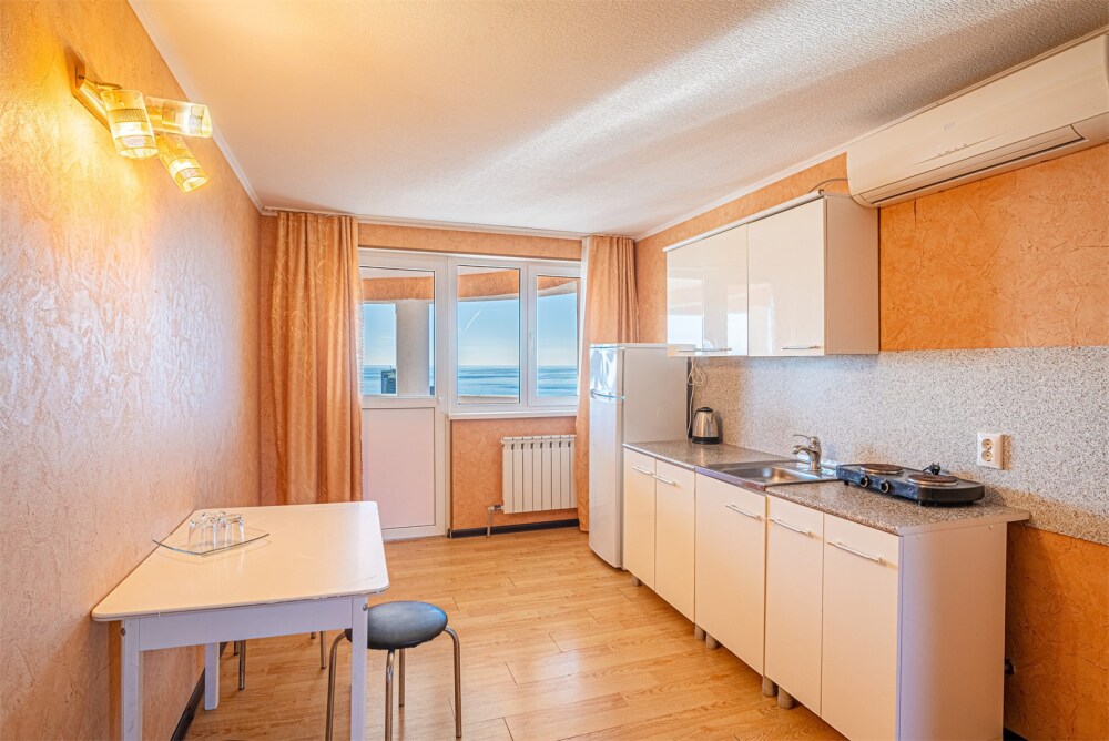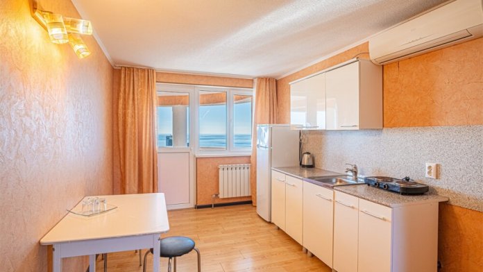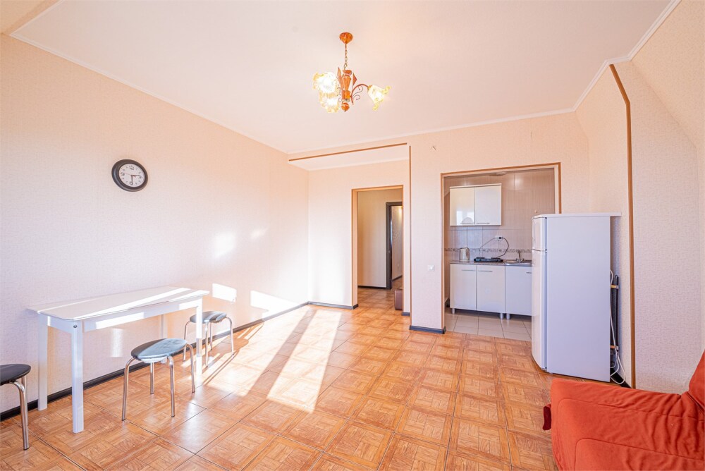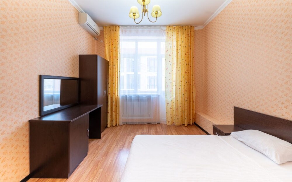 Просторный однокомнатный номер с двуспальной кроватью, раскладным диваном, кухней и балконом.