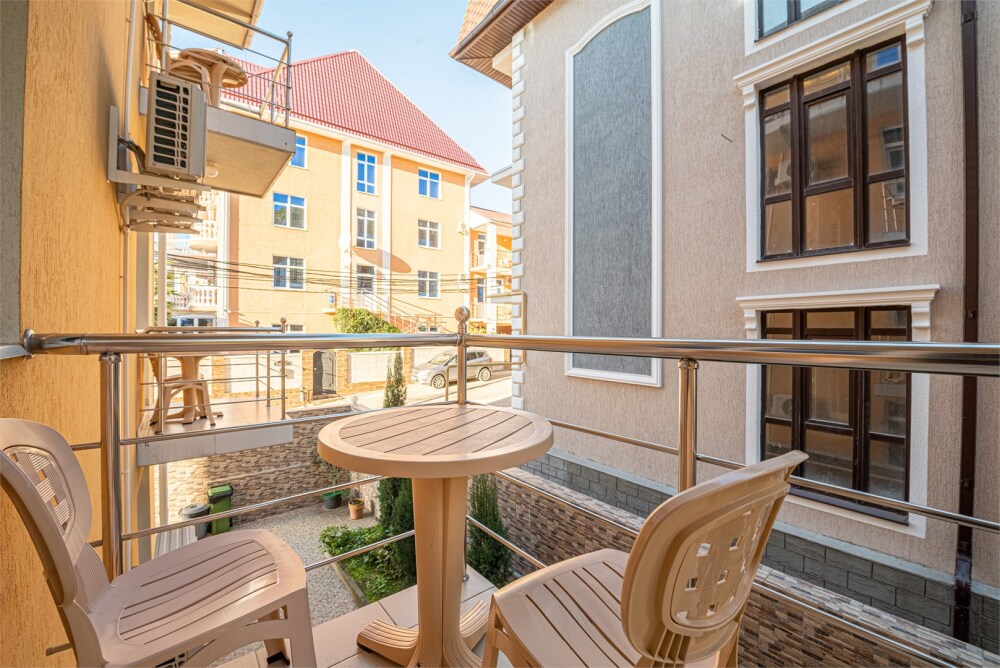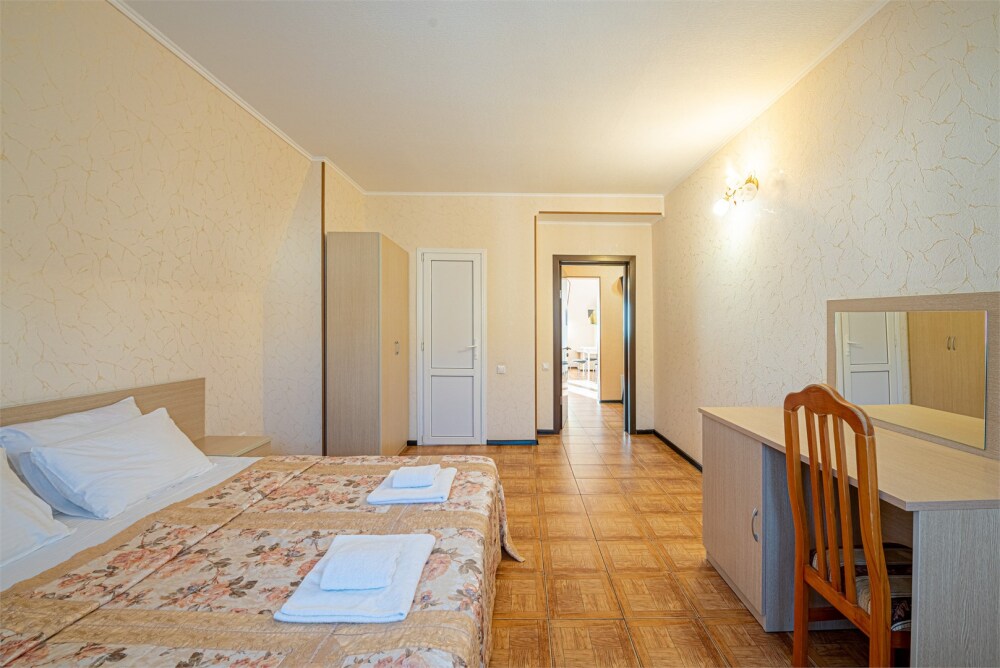Уютный номер с двуспальной кроватью или двумя односпальными кроватями, креслом-кроватью, либо раскладной кроватью и балконом с видом на море.