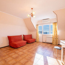 Просторный двухкомнатный номер с двуспальной кроватью, двумя одноместными раскладными диванами, кухней и балконом.