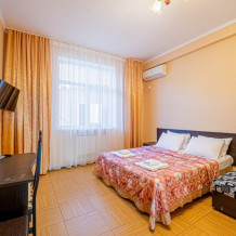 Комфортный однокомнатный номер с двуспальной кроватью, двухместным раскладным диваном и балконом.