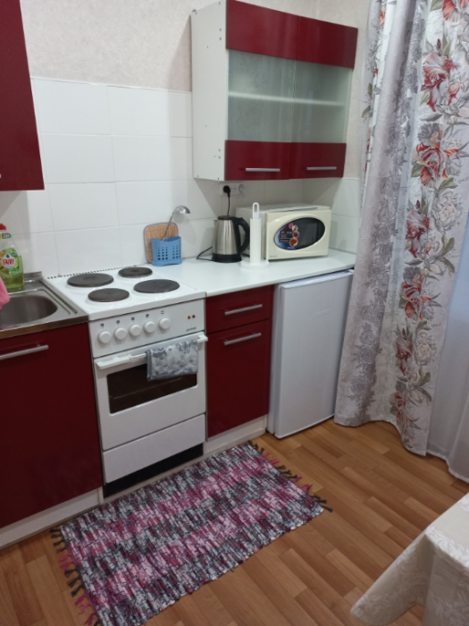 На комфортной кухне есть электроплита, столовые приборы, набор посуды, духовка, электрочайник, микроволновая печь, холодильник