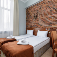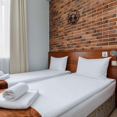 Две односпальные кровати с удобным матрасом и мягким пастельным бельём, тапочки и полотенца, прикроватное освещение и плотные ролл-шторы на окне.