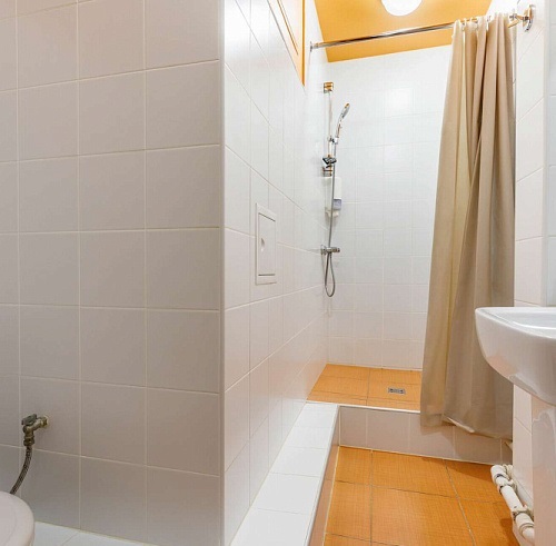 В ванной комнате - душевая кабина, туалетно-косметические принадлежности и фен.