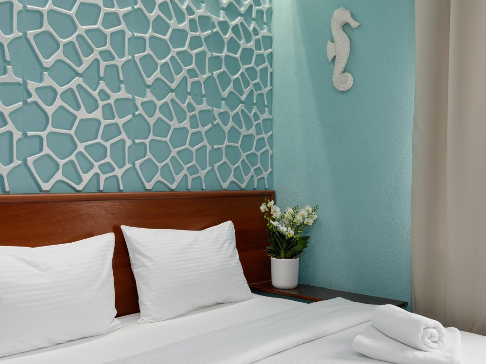 Двуспальная кровать с удобным матрасом и мягким пастельным бельем, тапочки и полотенца, прикроватное освещение и плотные ролл-шторы.