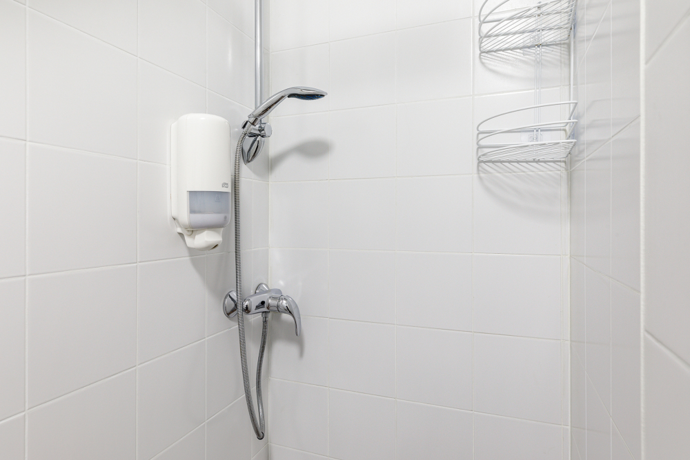 В ванной комнате душевая кабина, туалетно-косметические принадлежности и фен.