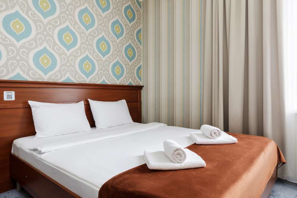 Двуспальная кровать с удобным матрасом и мягким пастельным бельём, тапочки и полотенца, прикроватное освещение и плотные ролл-шторы.