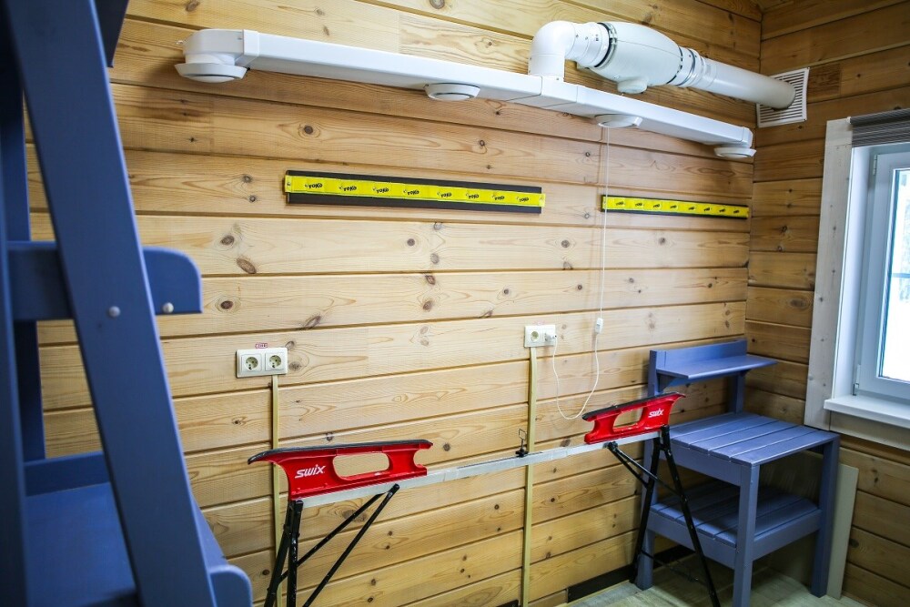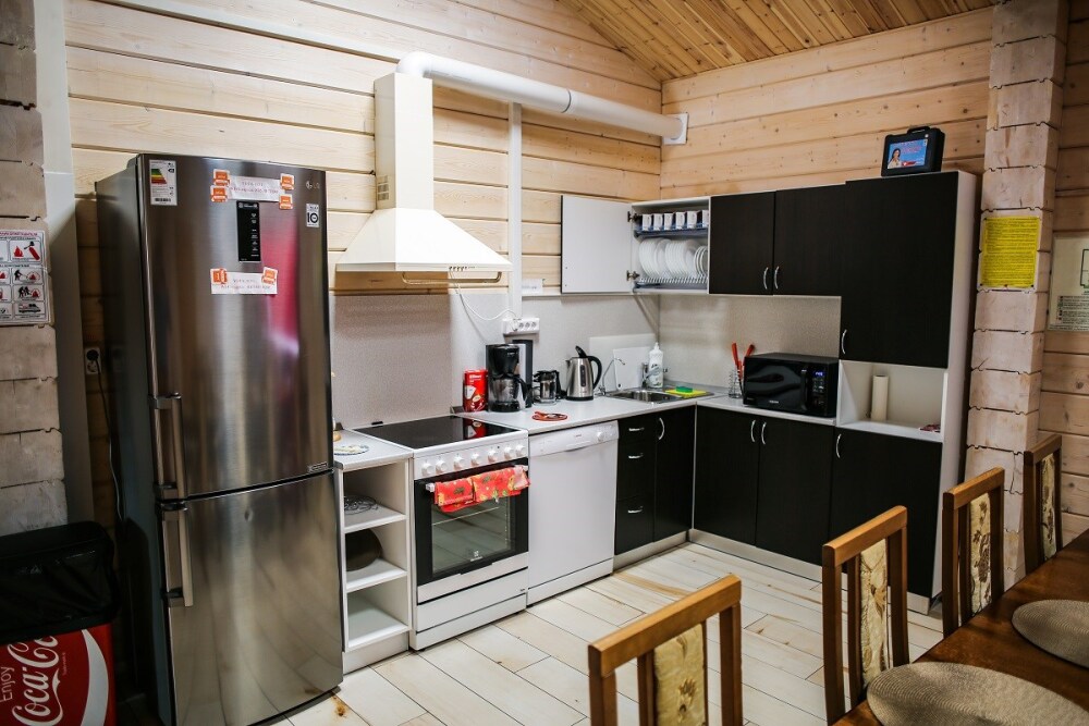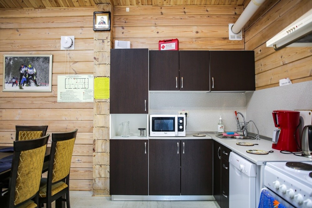 Дома оснащены уютной гостиной комнатой с диваном, большим обеденным столом, телевизором SMART, кухонным уголком, оборудованным бытовой техникой (плитой, холодильником, посудомоечной машиной, микроволновой печью, чайником, кофеваркой, кухонными принадлежностями, посудой), тремя душевыми комнатами совмещенными с сан. узлами, стиральной и сушильной машиной. В каждом коттедже индивидуальная система отопления, система “теплый пол”, а также сервисная комнатой для хранения и подготовки спортивного инвентаря. Бесплатный доступ в интернет (Wi-Fi).