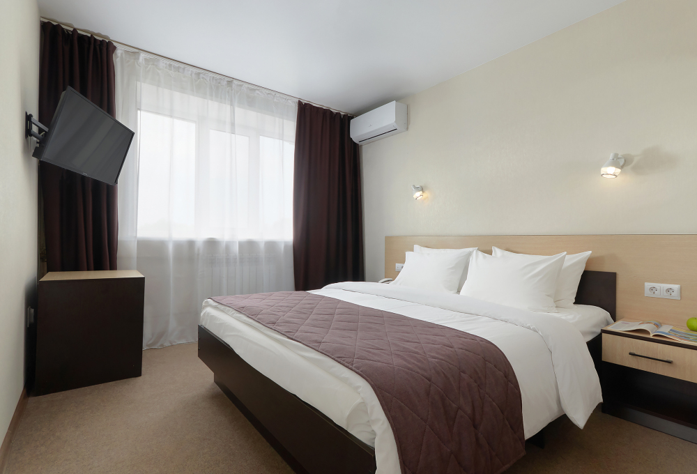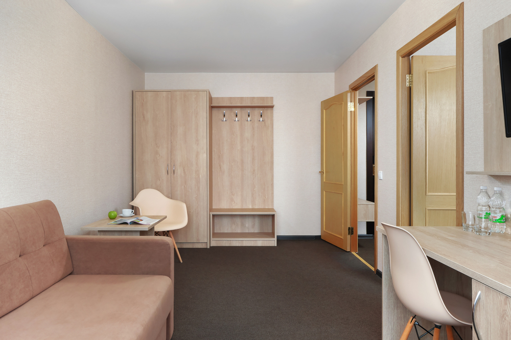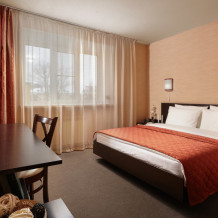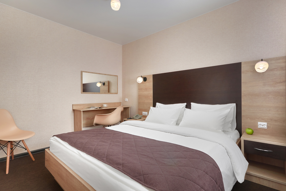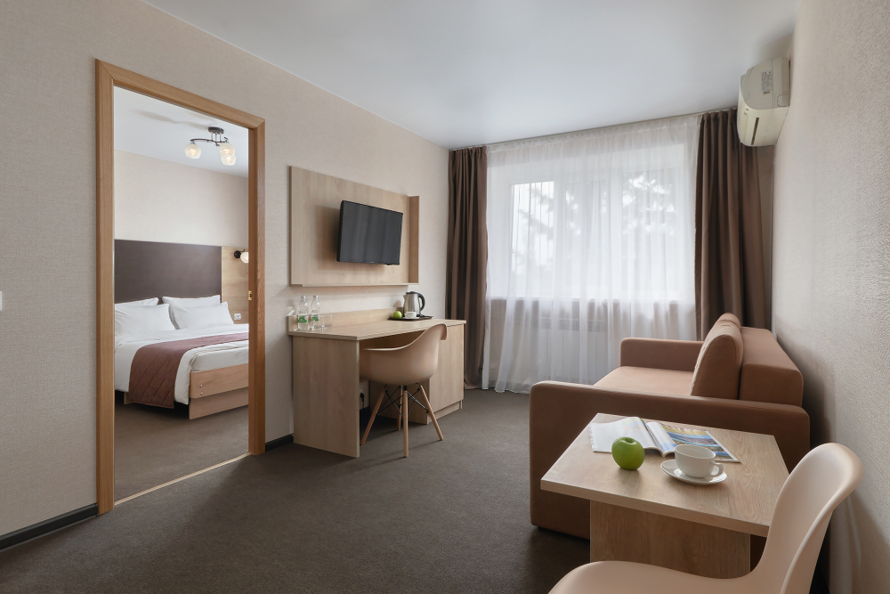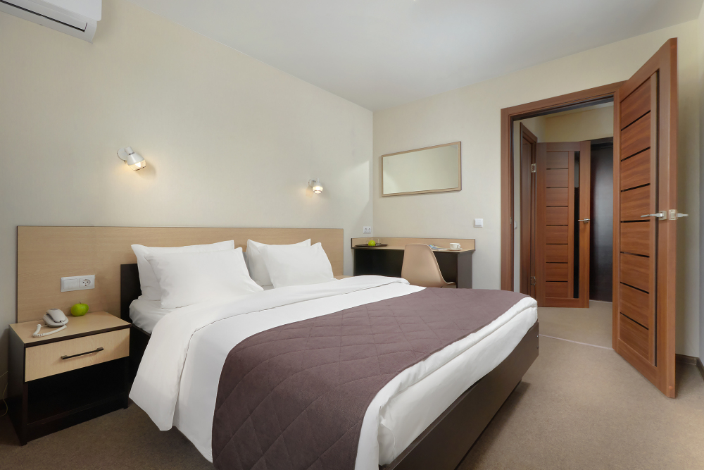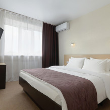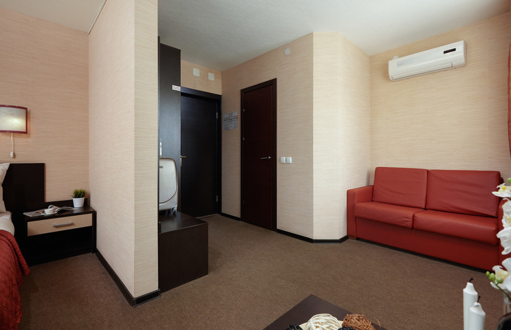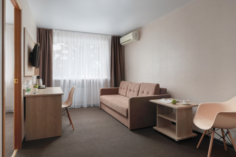 В номере: двуспальная кровать и диван-кровать, возможно трехместное размещение.