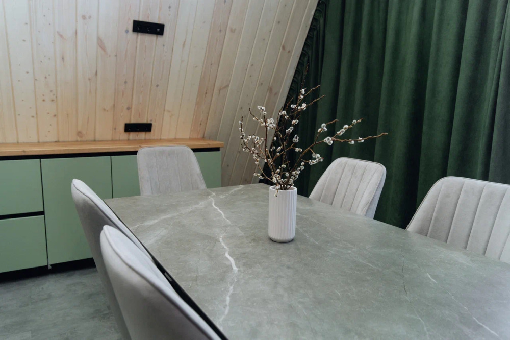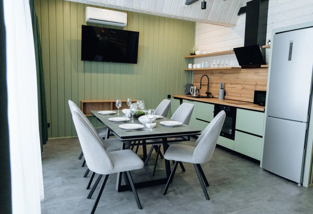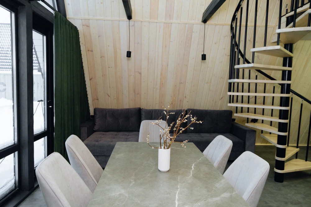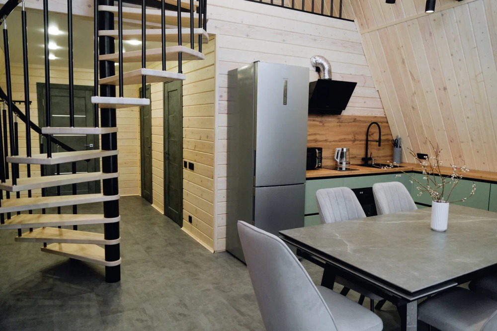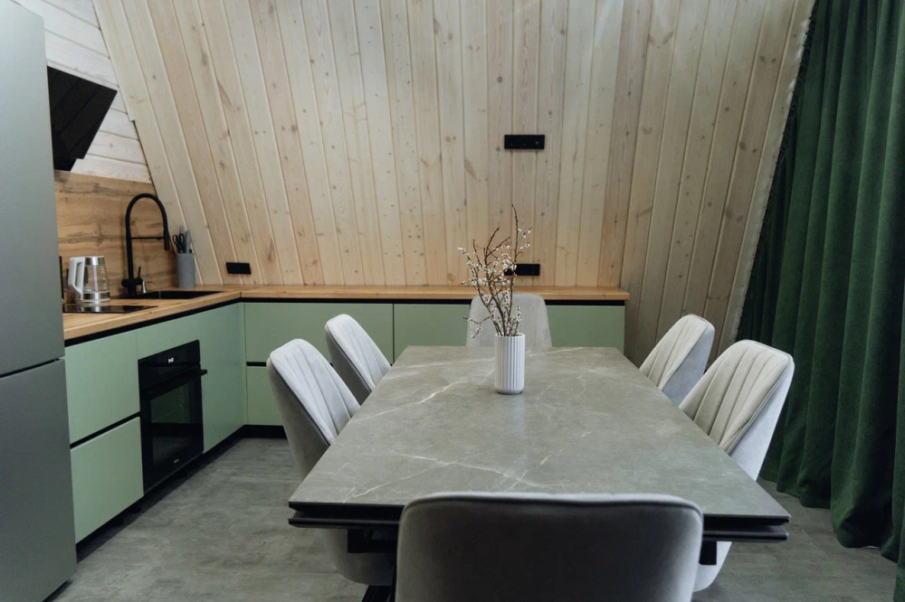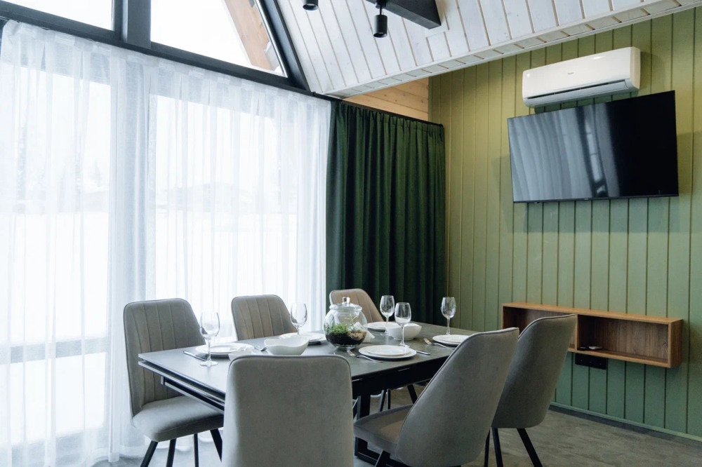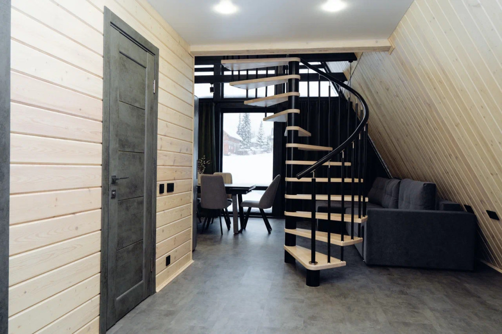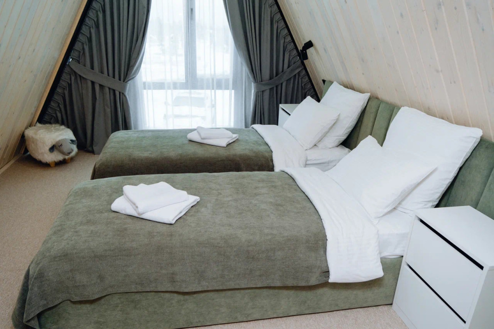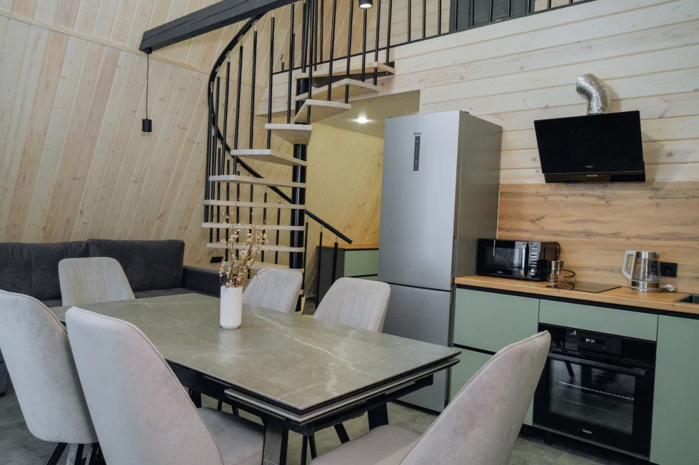 Уютный двухэтажный дом в стиле а-фрейм с видом на горы и огни курорта, рассчитанный для комфортного размещения 6 человек. В каждом домике есть все необходимое для приятного отдыха: стильный лаконичный дизайн, удобная мягкая мебель, большой набор посуды, стиральная машина, посудомоечная машина - здесь все продумано до мелочей.