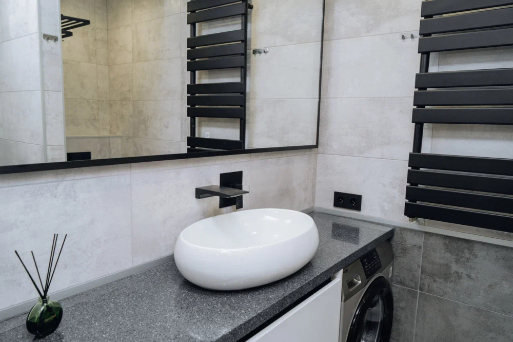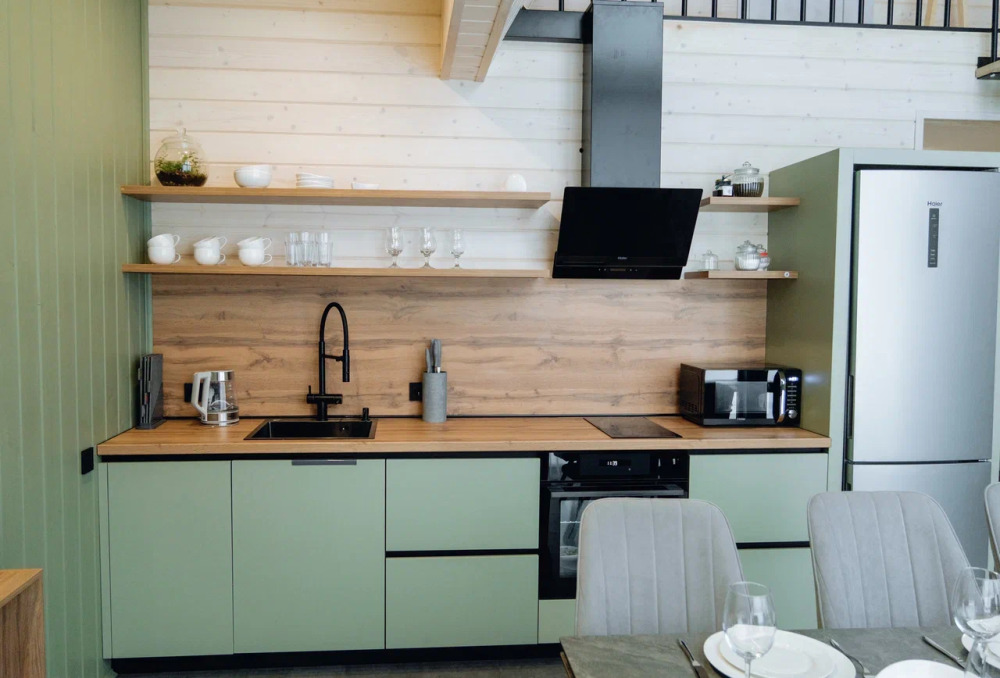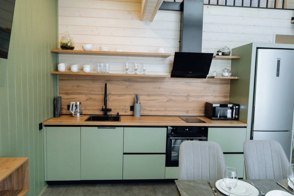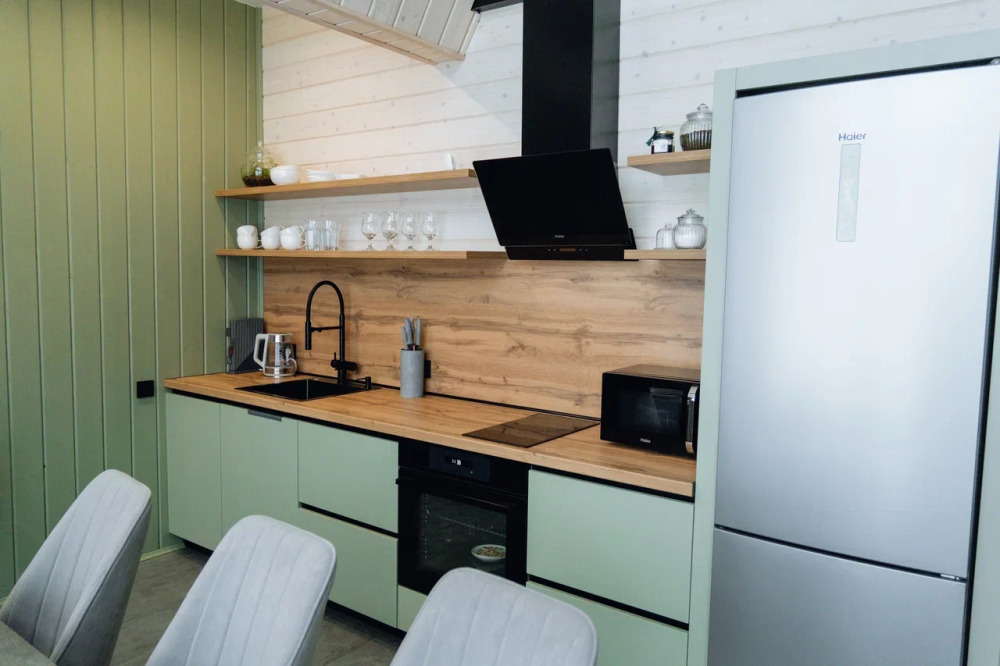 На кухне можно найти всё необходимое для приготовления вкуснейших блюд: гарнитур, СВЧ-печь, плита, духовой шкаф, холодильник, посудомоечная машина, обеденный стол и все нужные приборы.